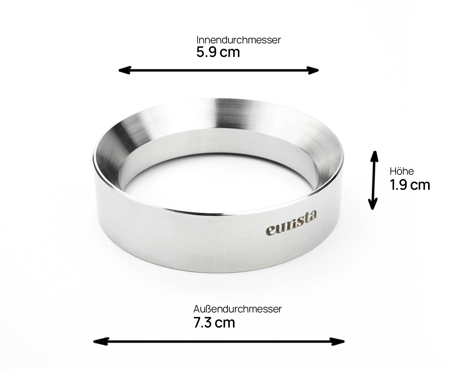 Der eurista Trichter besitzt die perfekten Maße in allen Dimensionen. Er ist gerade so hoch, dass er unter nahezu alle gängigen Mühlen-Modelle passt und gleichzeitig auch bei hoher Streuung das Mahlgut einfängt. Für Eureka Mignon Modelle ist ebenfalls eine geschlitzte Version des Trichters erhältlich. Durch die polierte Oberfläche und das gezielt gewählte Außenmaß erscheint er wie eine Verlängerung Ihres Siebträgers. Da Ihr Tamper durch den eurista Trichter hindurch passt, kann dieser während der gesamten Puck-Zubereitung auf dem Sieb positioniert bleiben.