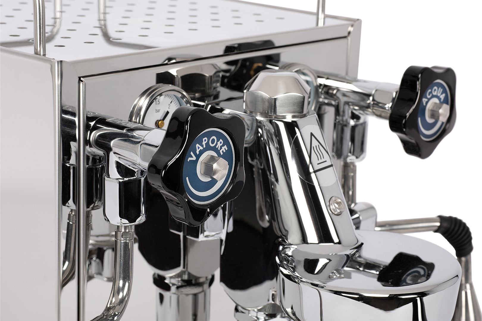 Die edle Edelstahlkonstruktion der Mechanika VI Slim ist nicht nur ein Blickfang, sondern auch robust und langlebig. Das Gehäuse im schicken Retro-Design überzeugt durch seine hochwertige Verarbeitung, welche sich auch in der Bedienung der Drehventile widerspiegelt. Der 2,2-Liter-Wassertank lässt sich bequem von oben befüllen und bietet ausreichend Kapazität für viele Espressi hintereinander.