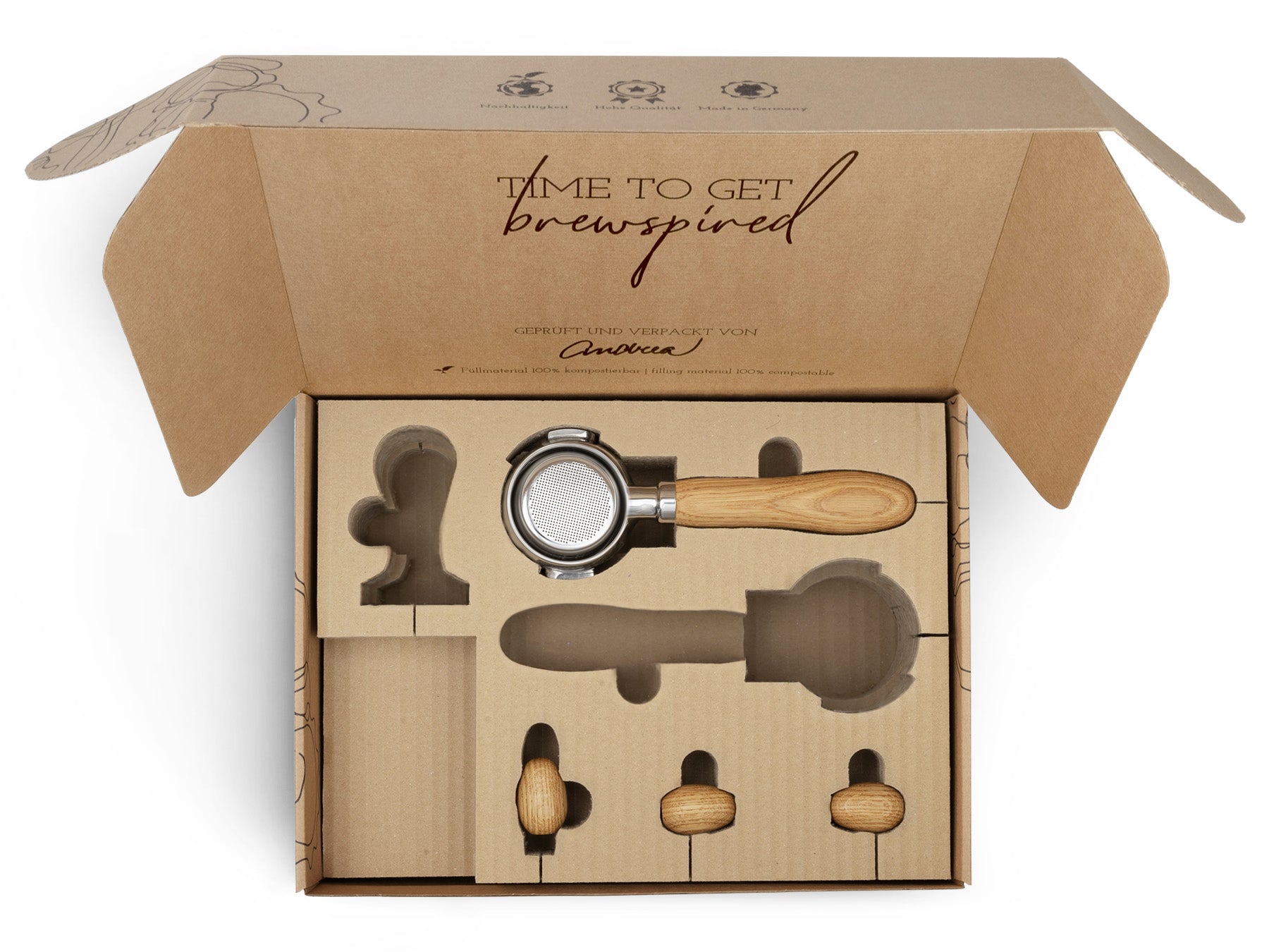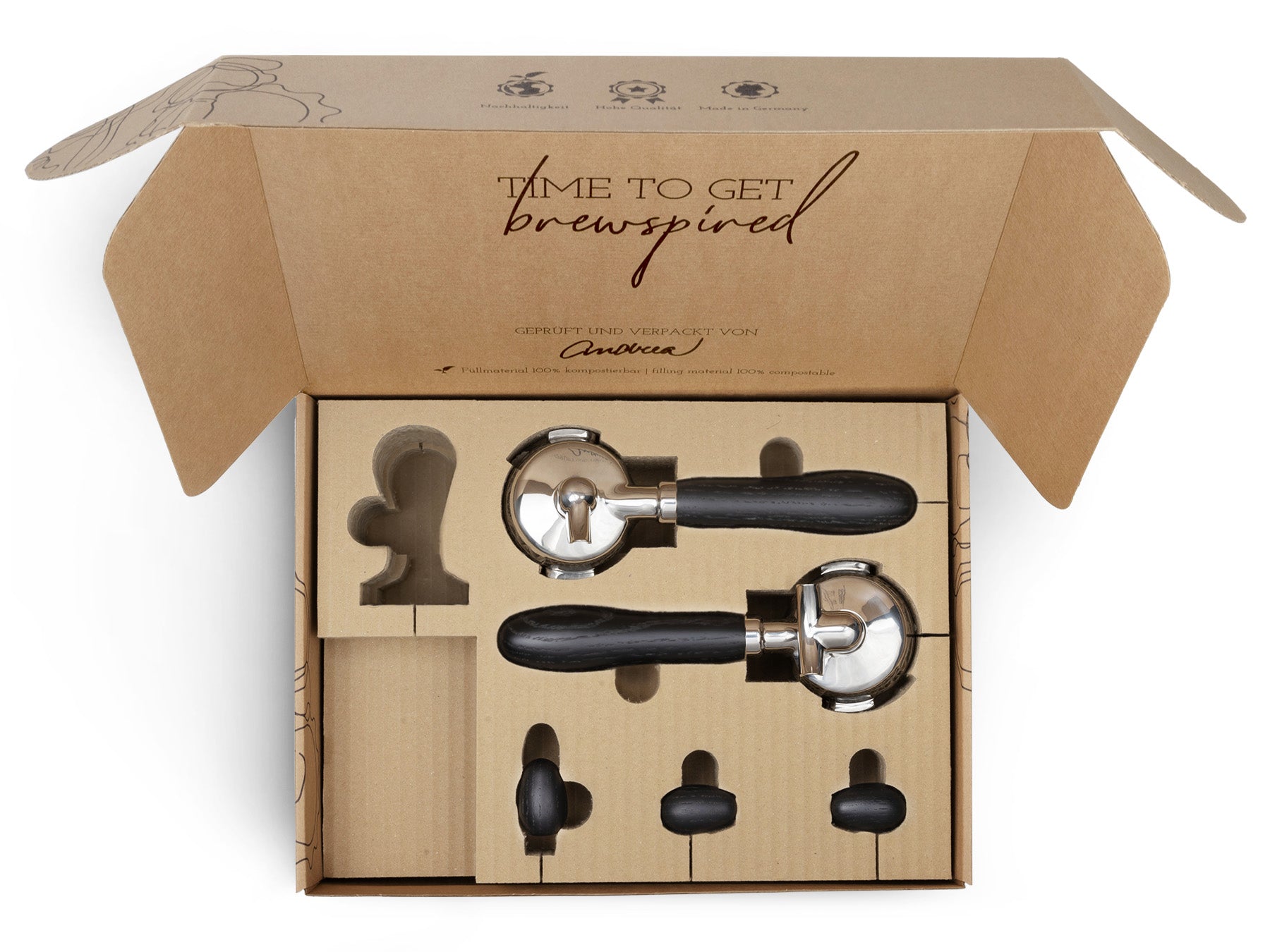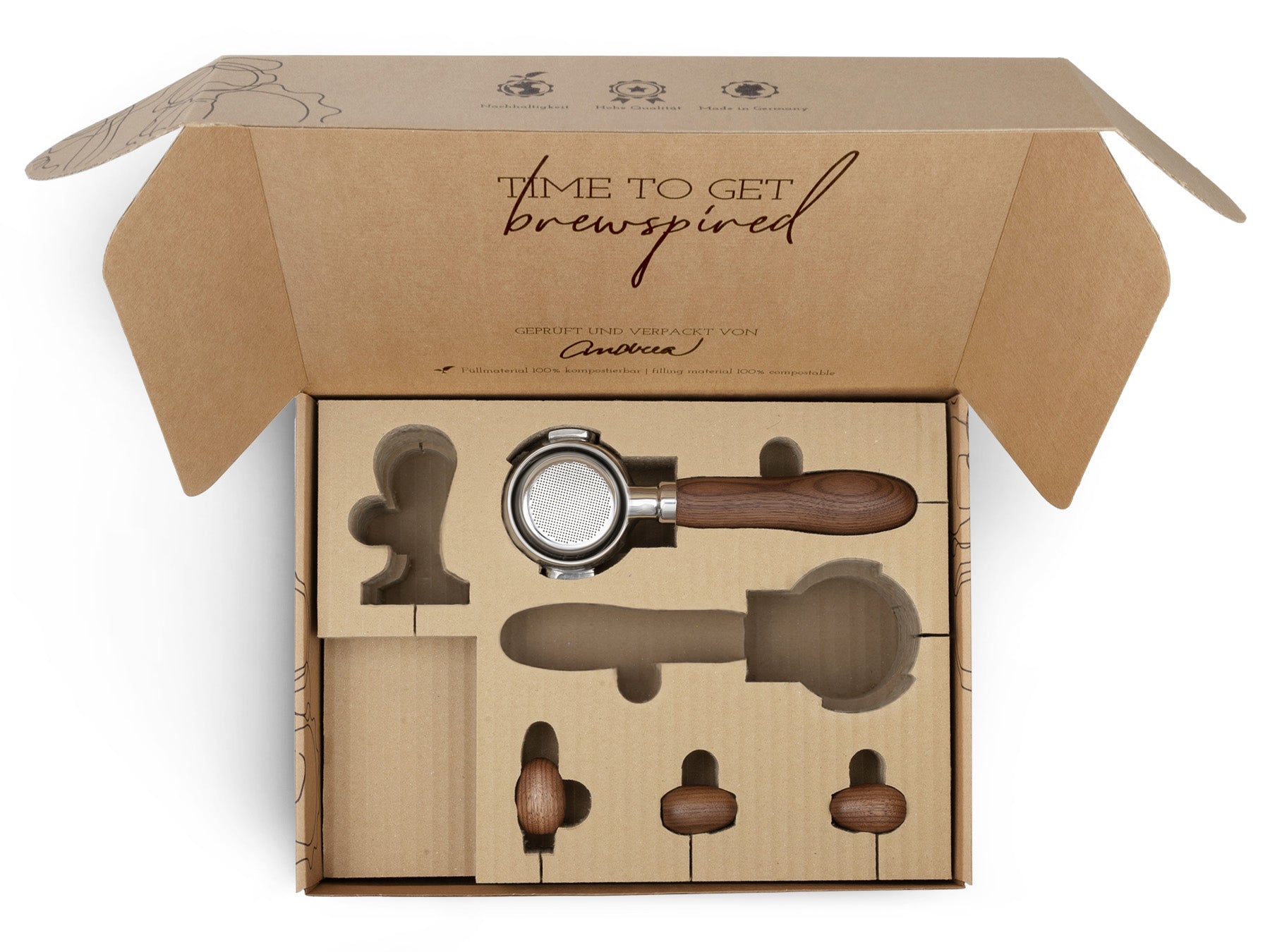 Wir von Brewspire stehen für Kaffee-Genuss mit allen Sinnen. Für viele Heimbaristi zählt die einheitliche Ästhetik der Kaffee-Ecke und das Gefühl der Espressozubereitung genauso dazu, wie der Genuss des Getränks selbst. Mit unseren Veredelungssets verleihst du deiner Siebträger-Espressomaschine den optischen und haptischen Feinschliff, der zu deinen Wünschen passt. Durch die eingelassene Edelstahlbeschwerung liegen unsere Siebträgergriffe angenehm und satt in der Hand. Unsere Veredelungssets sind flexibel erweiterbar: Die Accessoires der Marken Brewspire und eurista sind sprichwörtlich aus dem selben Holz geschnitzt.