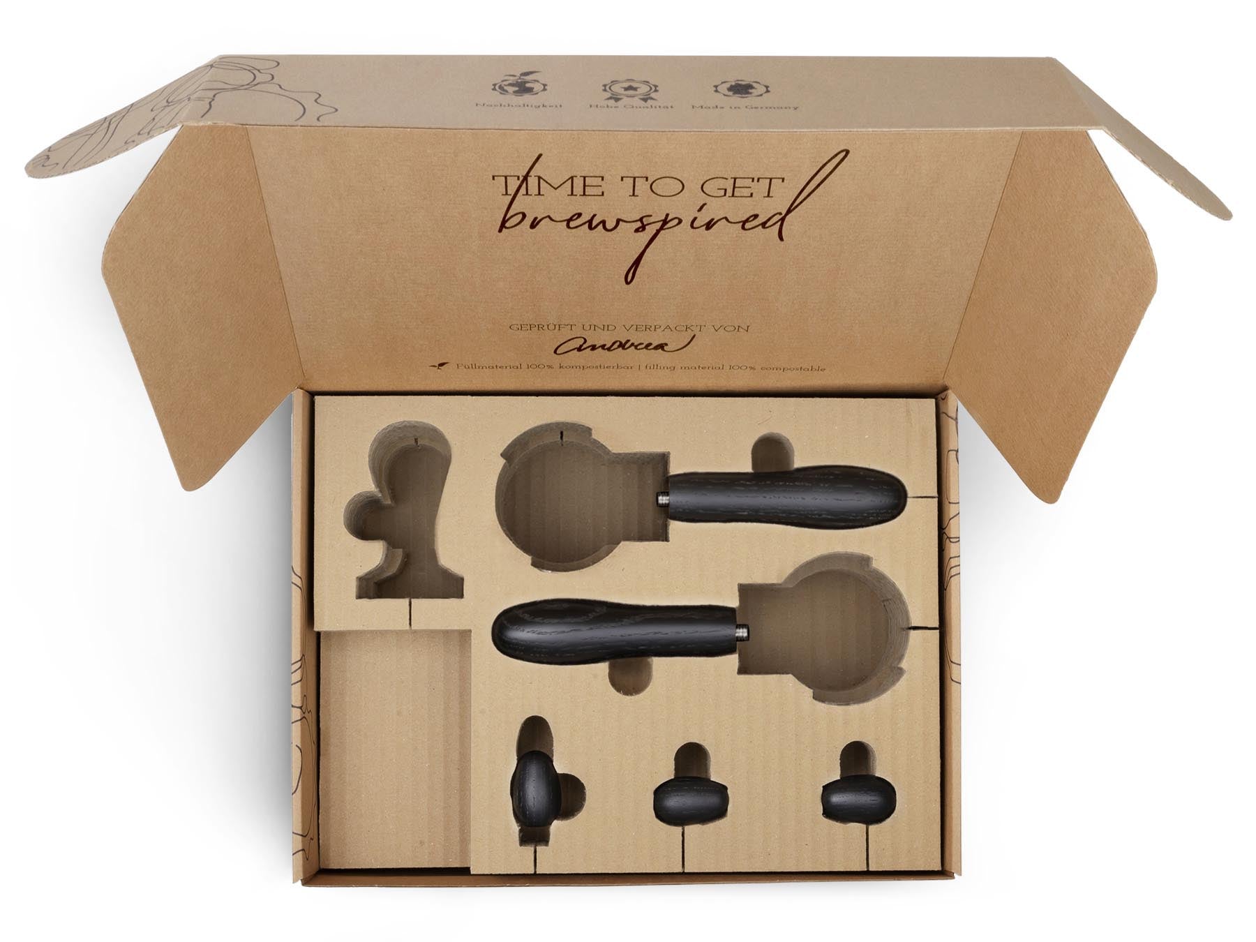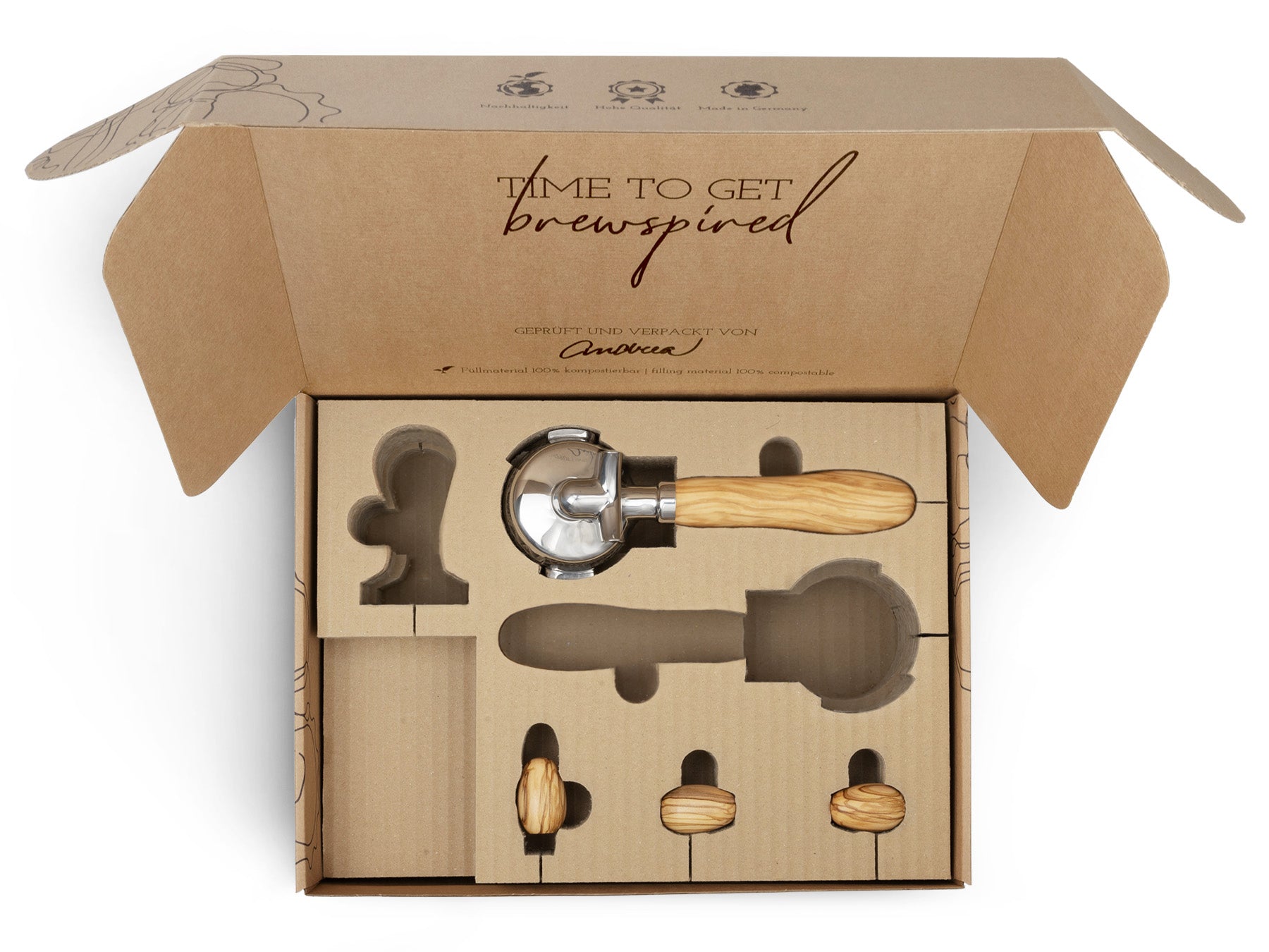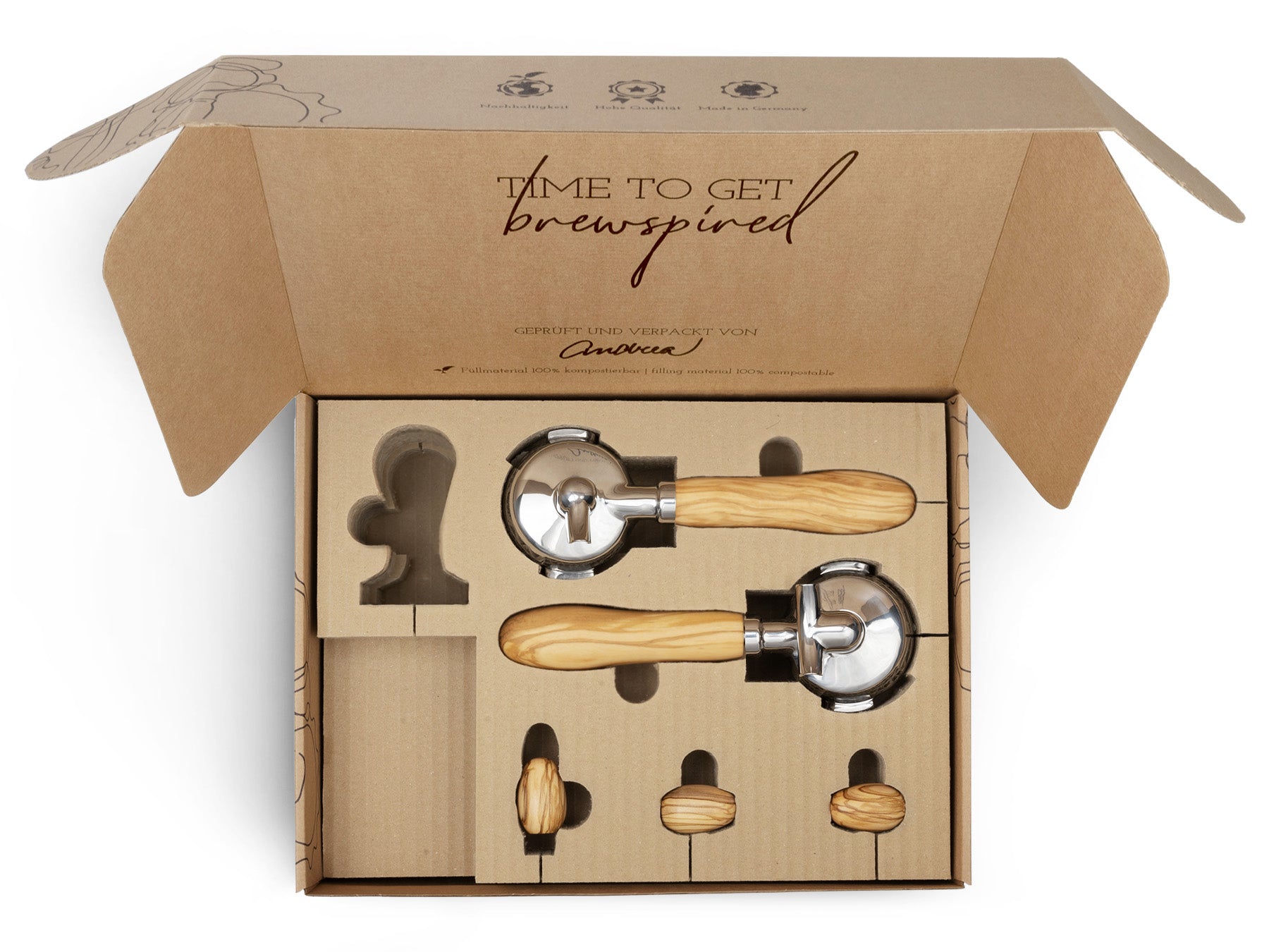 Wir von Brewspire stehen für Kaffee-Genuss mit allen Sinnen. Für viele Heimbaristi zählt die einheitliche Ästhetik der Kaffee-Ecke und das Gefühl der Espressozubereitung genauso dazu, wie der Genuss des Getränks selbst. Mit unseren Veredelungssets verleihst du deiner Siebträger-Espressomaschine den optischen und haptischen Feinschliff, der zu deinen Wünschen passt. Durch die eingelassene Edelstahlbeschwerung liegen unsere Siebträgergriffe angenehm und satt in der Hand. Unsere Veredelungssets sind flexibel erweiterbar: Die Accessoires der Marken Brewspire und eurista sind sprichwörtlich aus dem selben Holz geschnitzt.