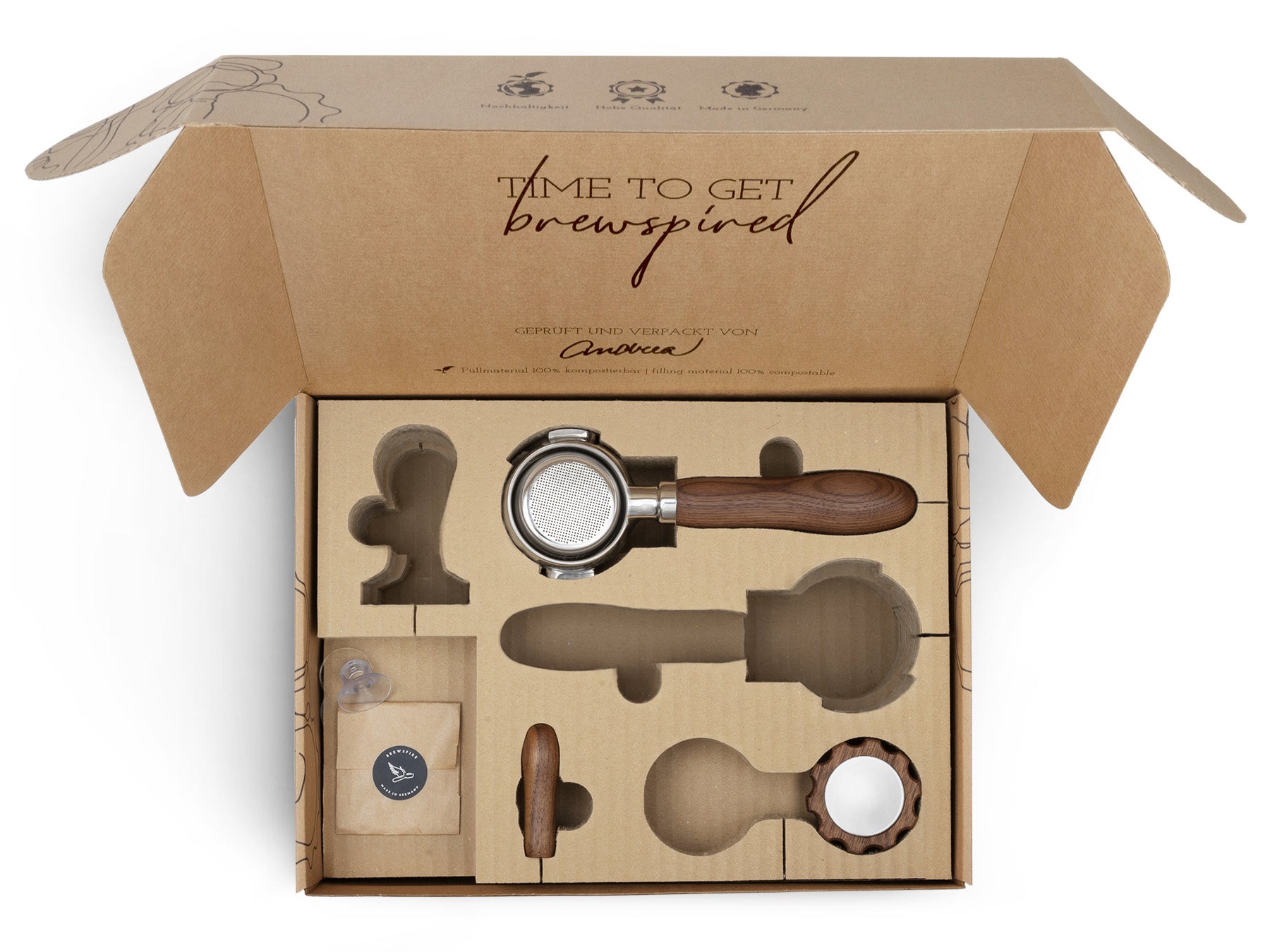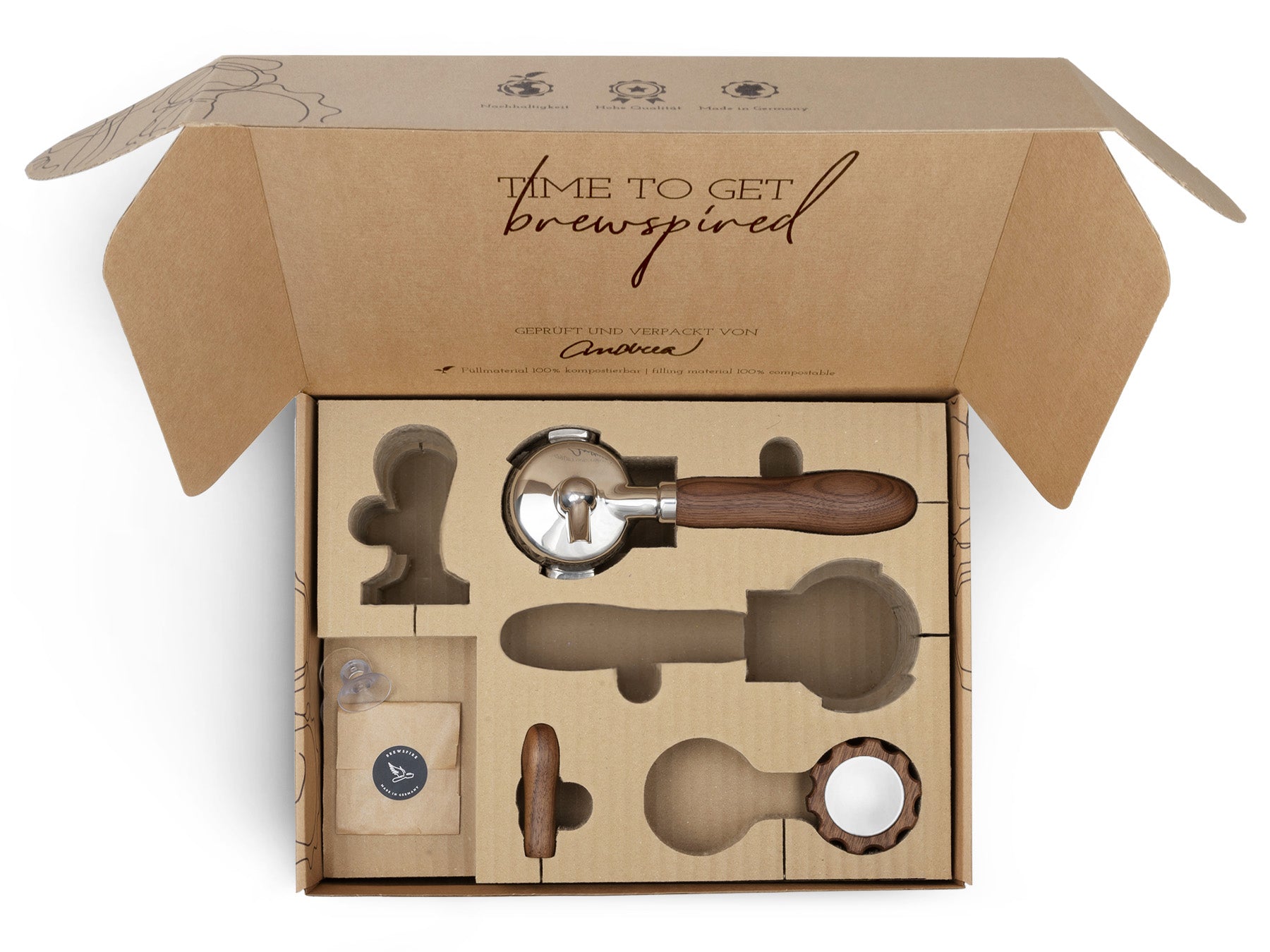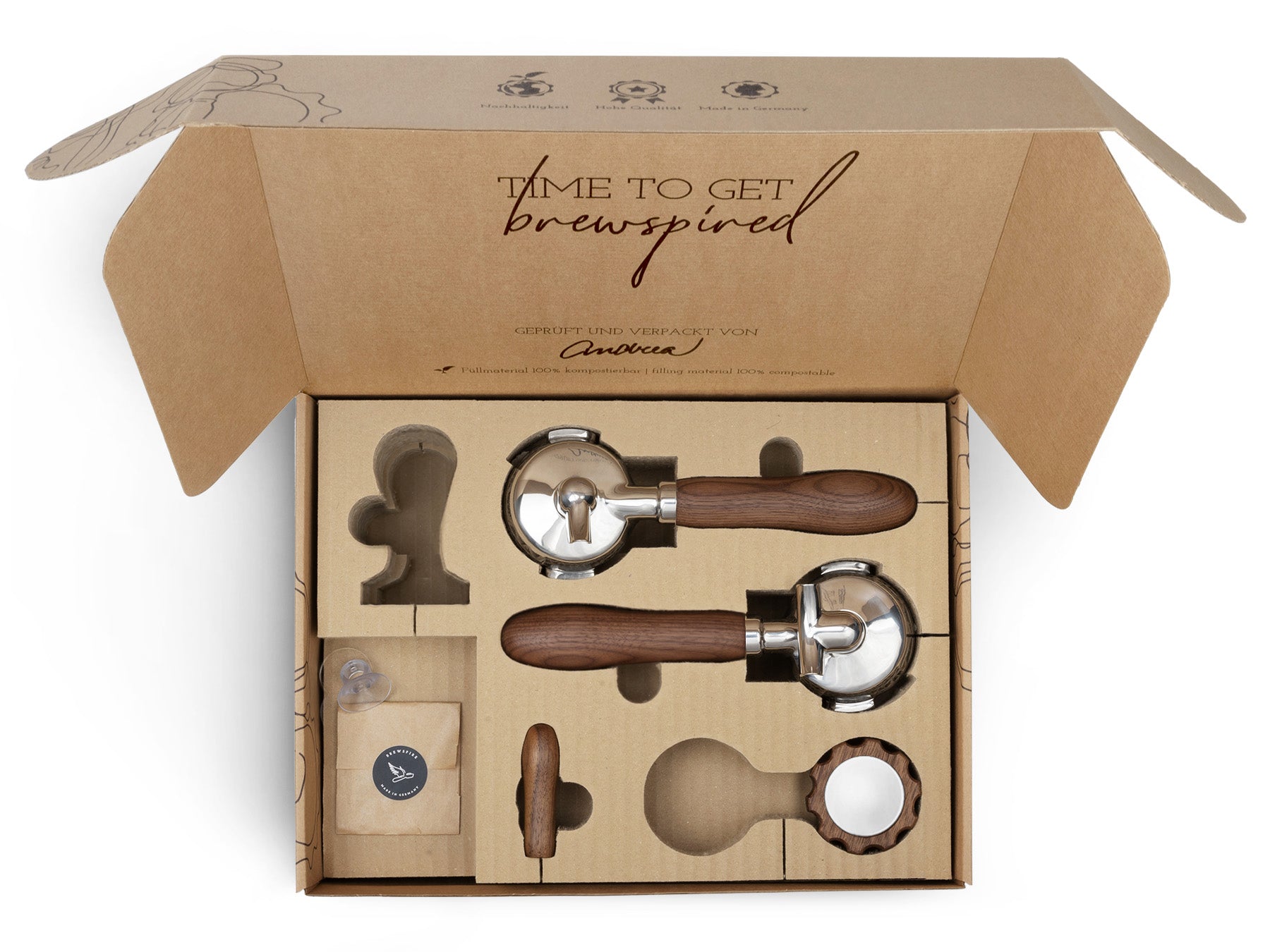 Wir von Brewspire stehen für Kaffee-Genuss mit allen Sinnen. Für viele Heimbaristi zählt die einheitliche Ästhetik der Kaffee-Ecke und das Gefühl der Espressozubereitung genauso dazu, wie der Genuss des Getränks selbst. Mit unseren Veredelungssets verleihst du deiner Siebträger-Espressomaschine den optischen und haptischen Feinschliff, der zu deinen Wünschen passt. Die Nobel-Griffserie von Brewspire eignet sich besonders als Upgrade für elegante E61-Klassiker wie z.B. ECM-Maschinen. Der nahtlose Übergang von geöltem Vollholz zu poliertem Edelstahl sorgt für eine hochwertige Haptik und Optik. Das Brewspire Unterscheidungsmerkmal: Im Griff befindet sich eine integrierte thermische Entkopplung, damit der Edelstahlteil nicht zu heiß wird. Unsere Veredelungssets sind flexibel erweiterbar: Die Accessoires der Marken Brewspire und eurista sind sprichwörtlich aus dem selben Holz geschnitzt.