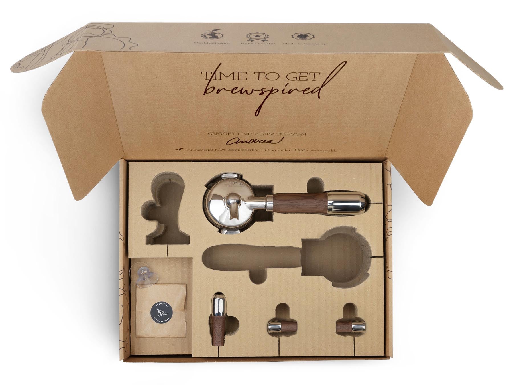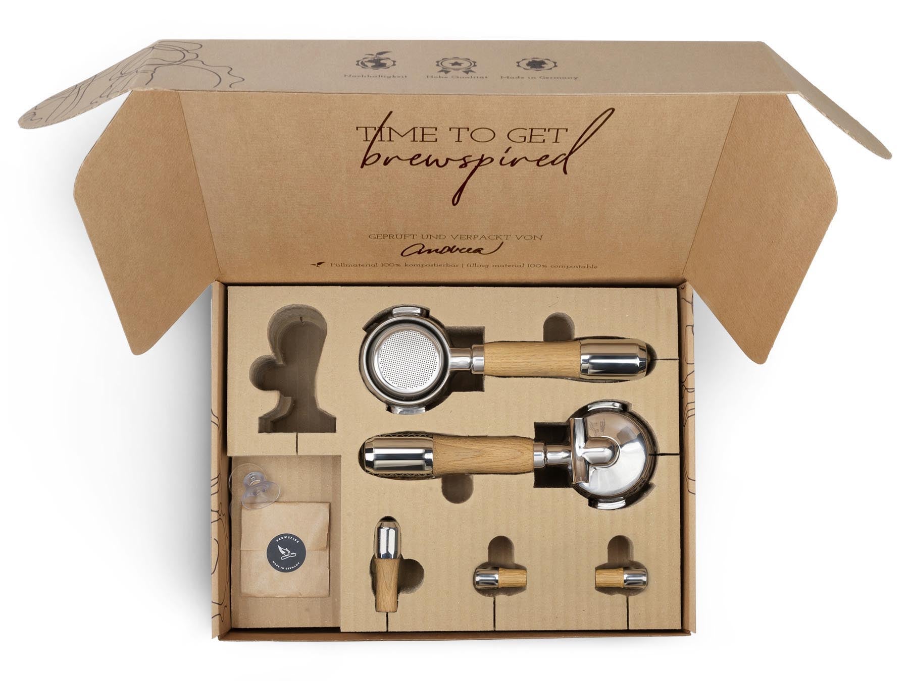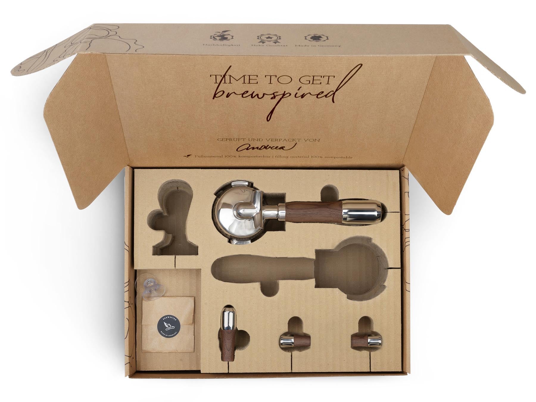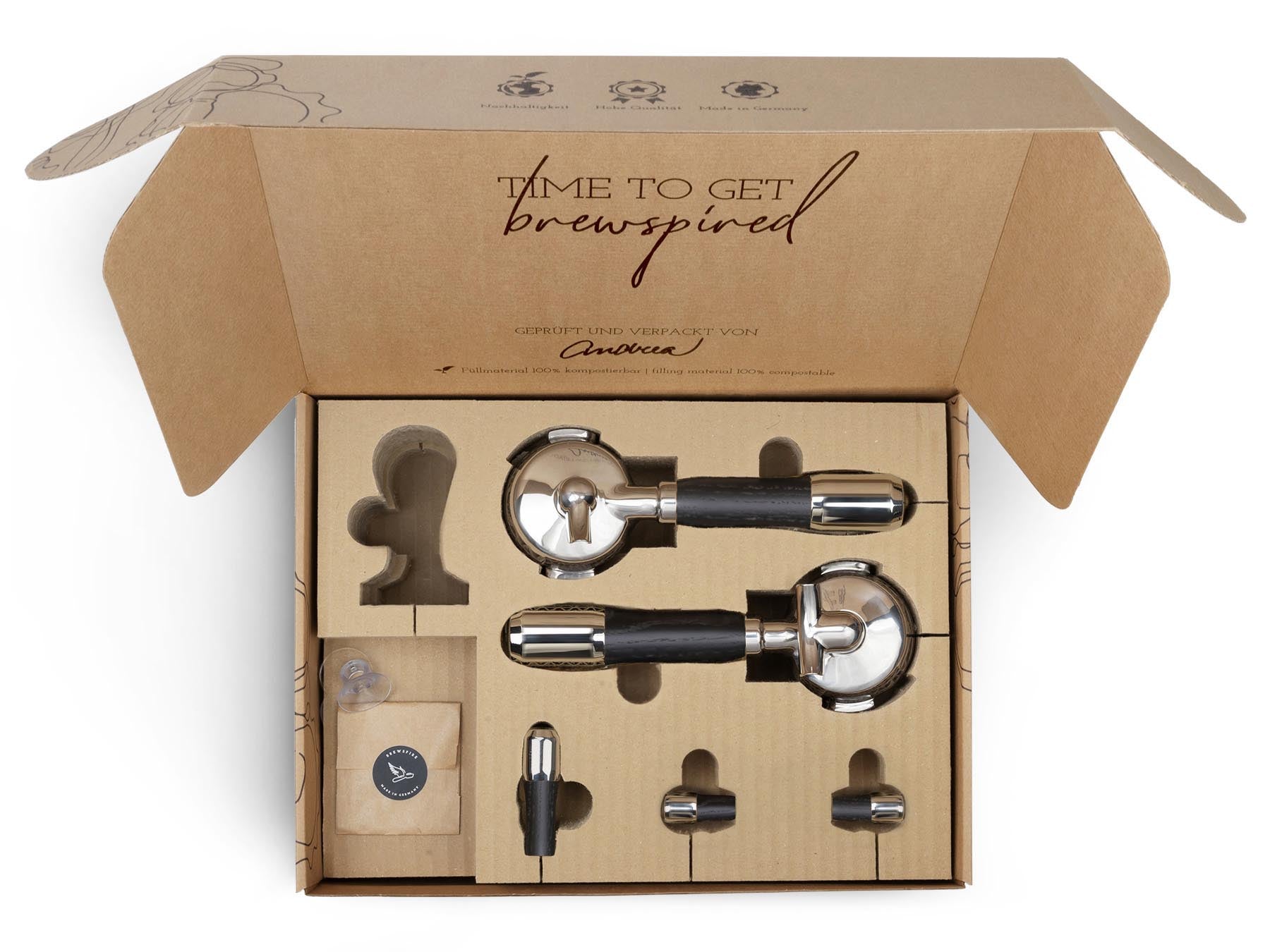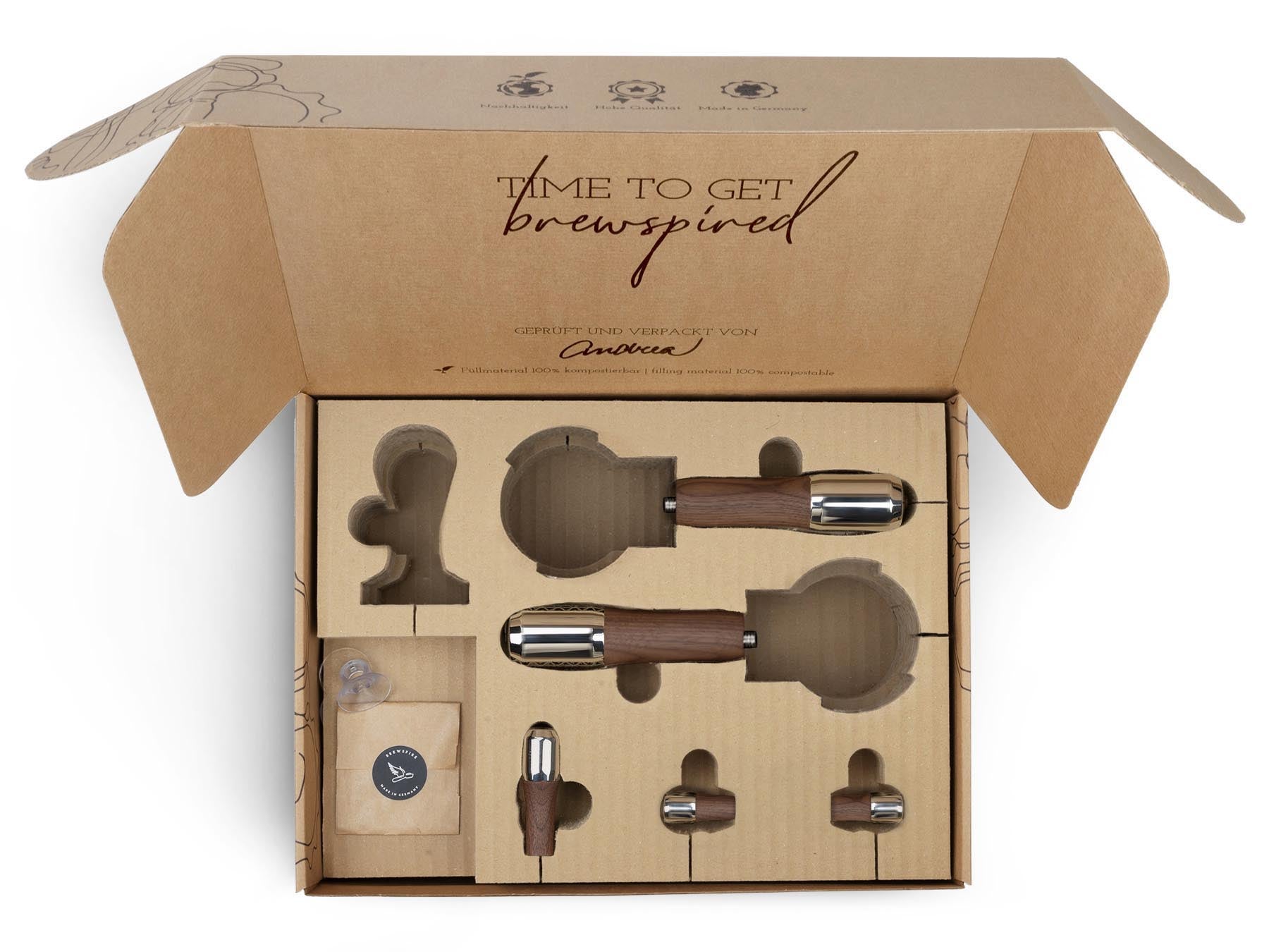 Wir von Brewspire stehen für Kaffee-Genuss mit allen Sinnen. Für viele Heimbaristi zählt die einheitliche Ästhetik der Kaffee-Ecke und das Gefühl der Espressozubereitung genauso dazu, wie der Genuss des Getränks selbst. Mit unseren Veredelungssets verleihst du deiner Siebträger-Espressomaschine den optischen und haptischen Feinschliff, der zu deinen Wünschen passt. Die Nobel-Griffserie von Brewspire eignet sich besonders als Upgrade für elegante E61-Klassiker wie z.B. ECM-Maschinen. Der nahtlose Übergang von geöltem Vollholz zu poliertem Edelstahl sorgt für eine hochwertige Haptik und Optik. Das Brewspire Unterscheidungsmerkmal: Im Griff befindet sich eine integrierte thermische Entkopplung, damit der Edelstahlteil nicht zu heiß wird. Unsere Veredelungssets sind flexibel erweiterbar: Die Accessoires der Marken Brewspire und eurista sind sprichwörtlich aus dem selben Holz geschnitzt.