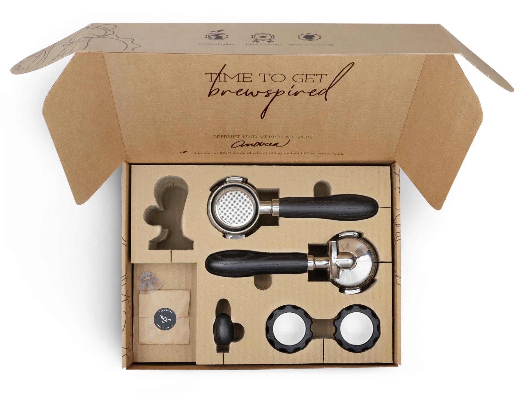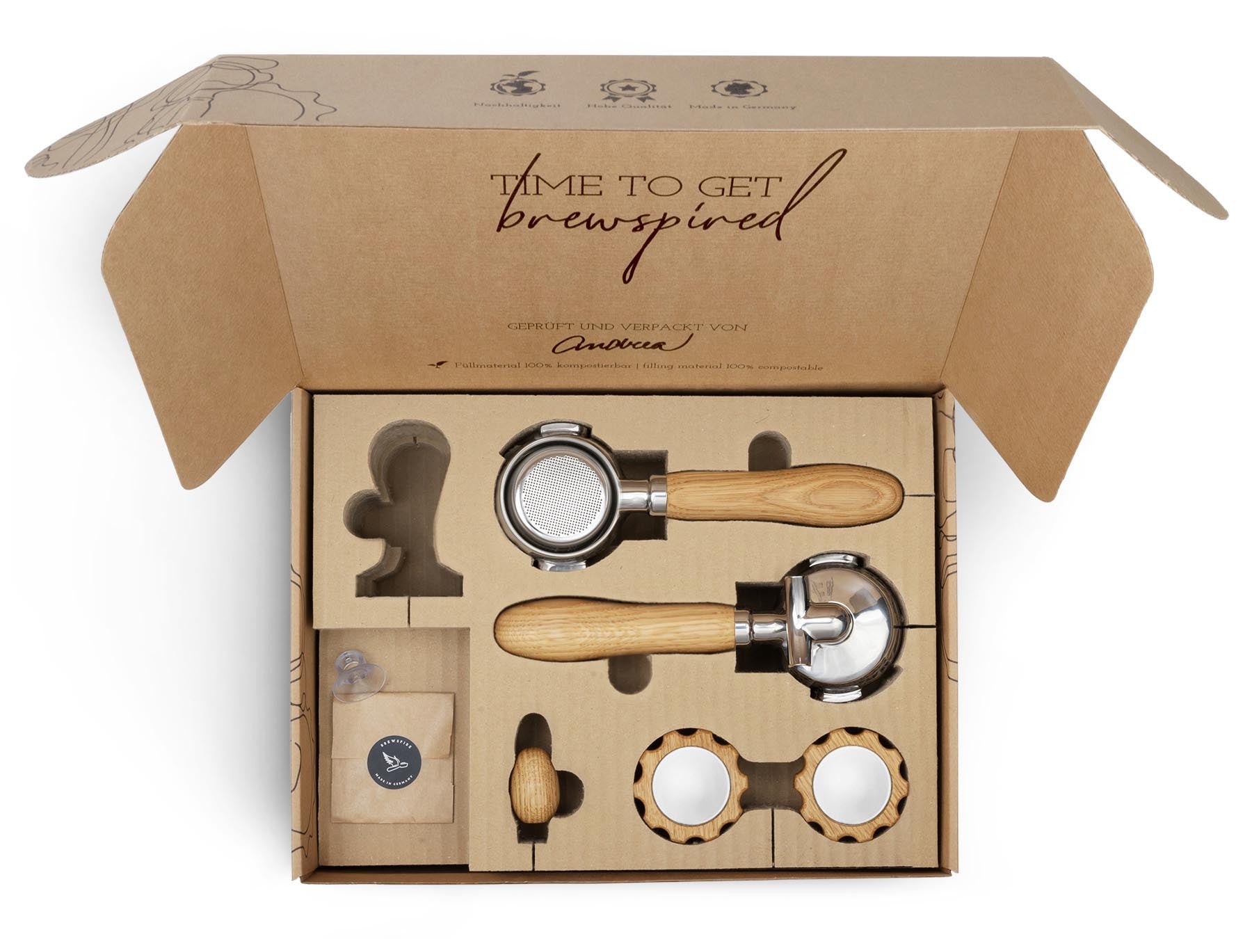 Wir von Brewspire stehen für Kaffee-Genuss mit allen Sinnen. Für viele Heimbaristi zählt die einheitliche Ästhetik der Kaffee-Ecke und das Gefühl der Espressozubereitung genauso dazu, wie der Genuss des Getränks selbst. Mit unseren Veredelungssets verleihst du deiner Siebträger-Espressomaschine den optischen und haptischen Feinschliff, der zu deinen Wünschen passt. Durch die eingelassene Edelstahlbeschwerung liegen unsere Siebträgergriffe angenehm und satt in der Hand. Unsere Veredelungssets sind flexibel erweiterbar: Die Accessoires der Marken Brewspire und eurista sind sprichwörtlich aus dem selben Holz geschnitzt.