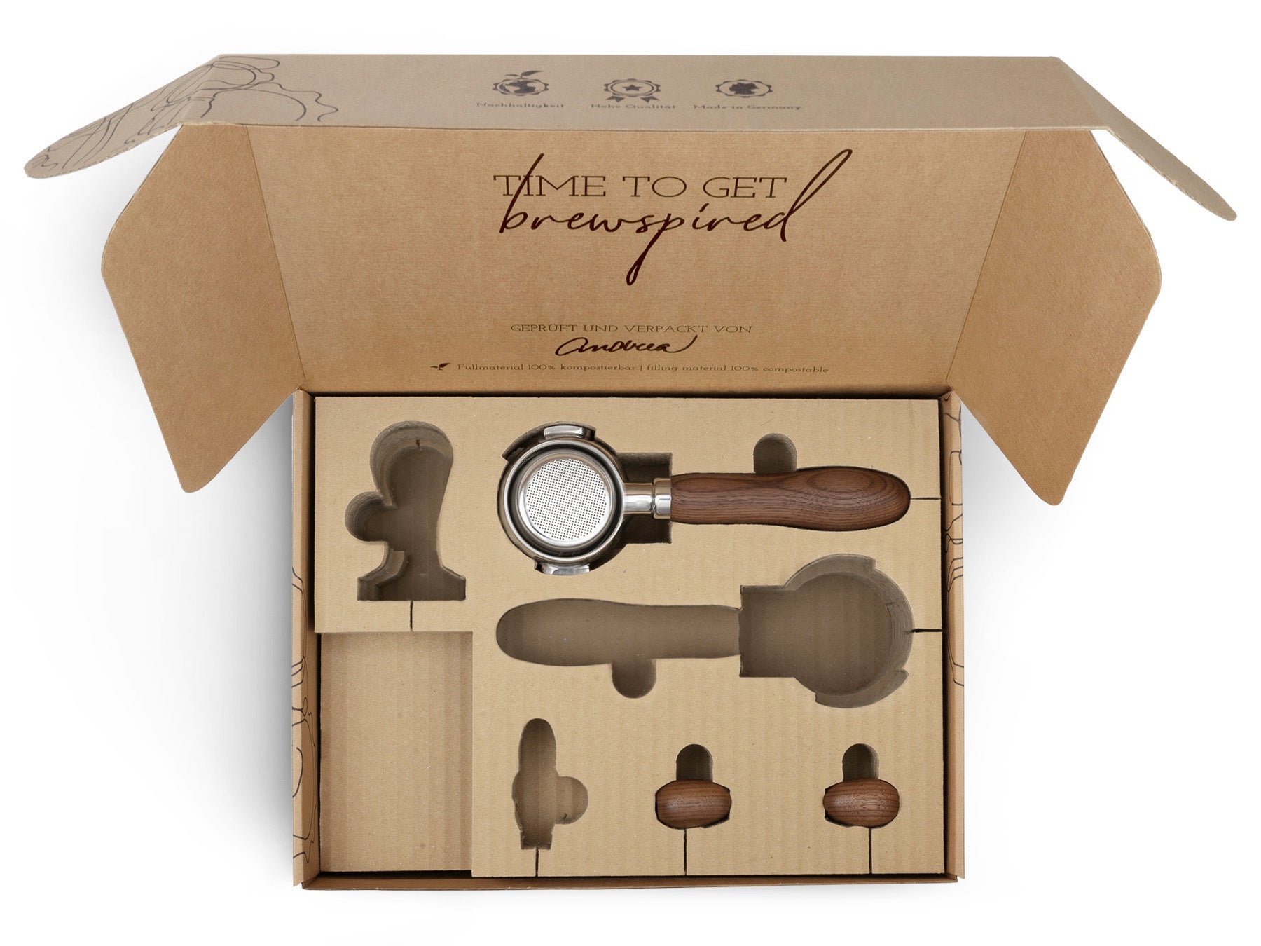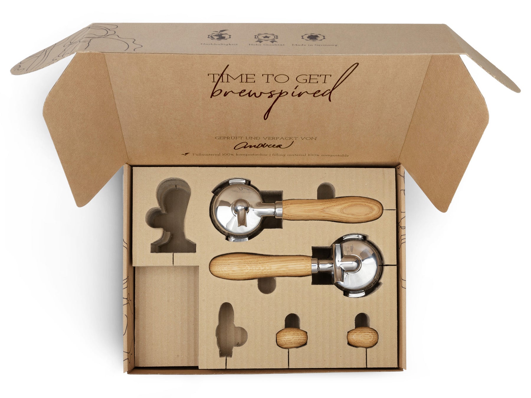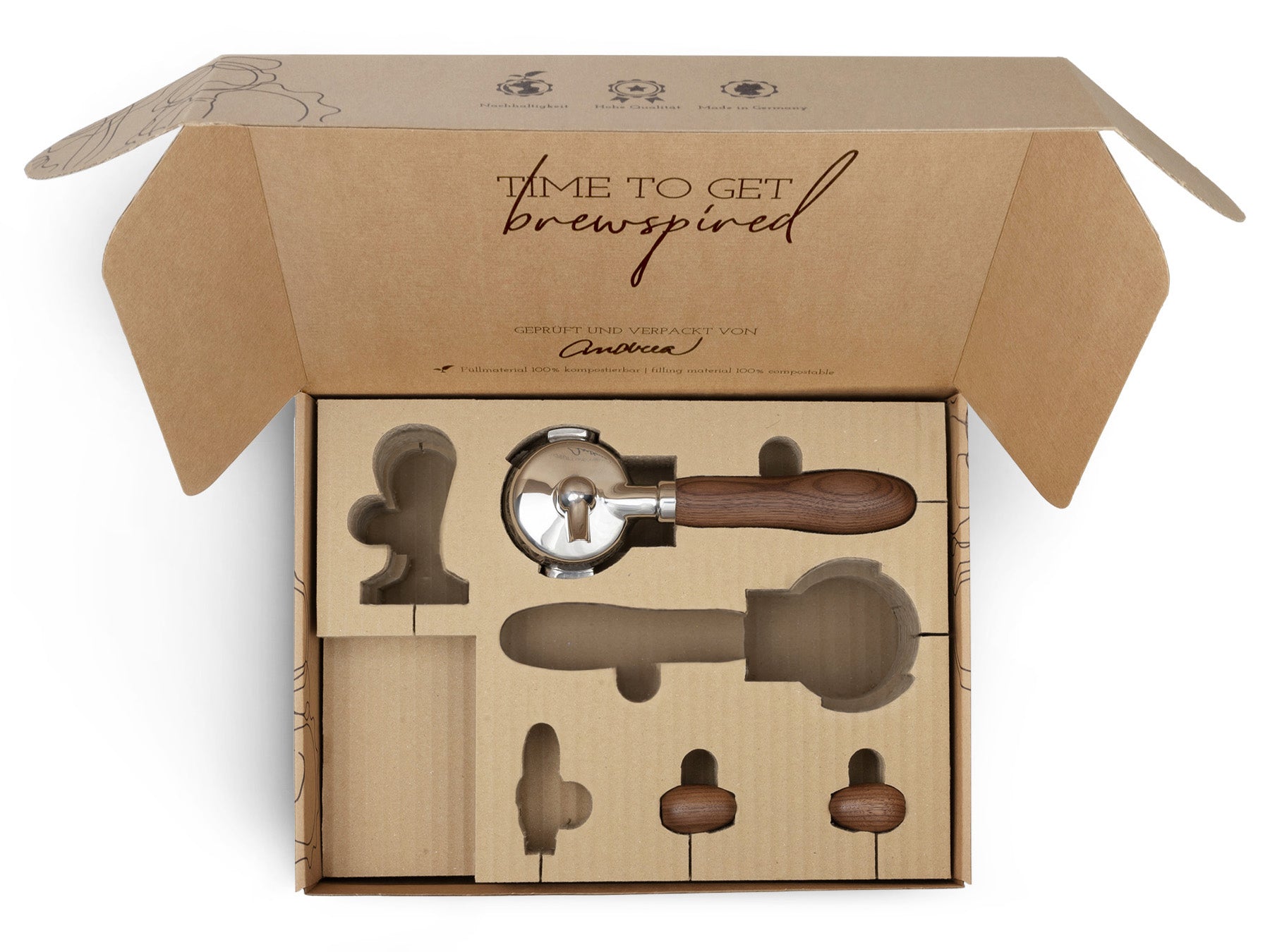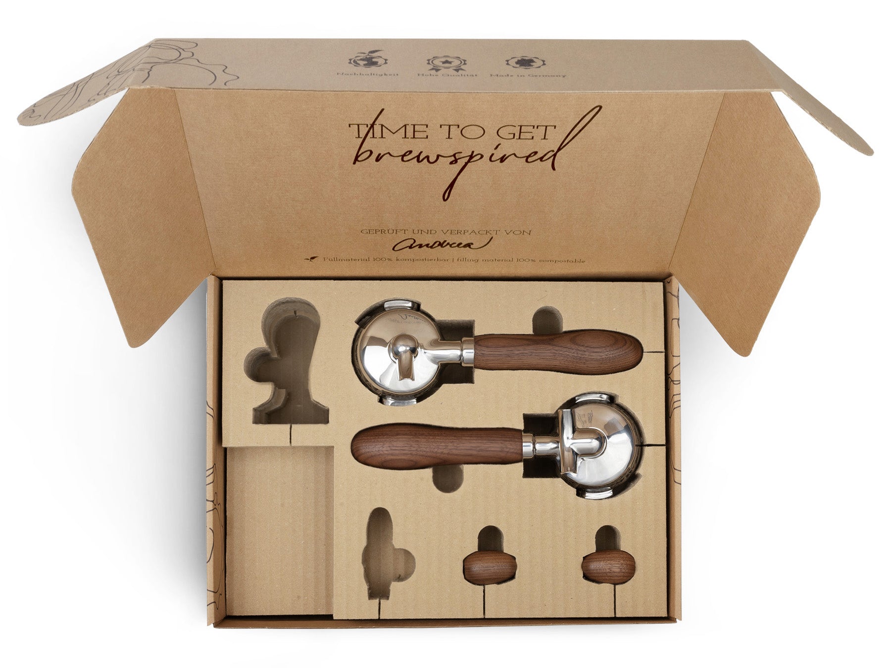 Wir von Brewspire stehen für Kaffee-Genuss mit allen Sinnen. Für viele Heimbaristi zählt die einheitliche Ästhetik der Kaffee-Ecke und das Gefühl der Espressozubereitung genauso dazu, wie der Genuss des Getränks selbst. Mit unseren Veredelungssets verleihst du deiner Siebträger-Espressomaschine den optischen und haptischen Feinschliff, der zu deinen Wünschen passt. Durch die eingelassene Edelstahlbeschwerung liegen unsere Siebträgergriffe angenehm und satt in der Hand. Unsere Veredelungssets sind flexibel erweiterbar: Die Accessoires der Marken Brewspire und eurista sind sprichwörtlich aus dem selben Holz geschnitzt.
