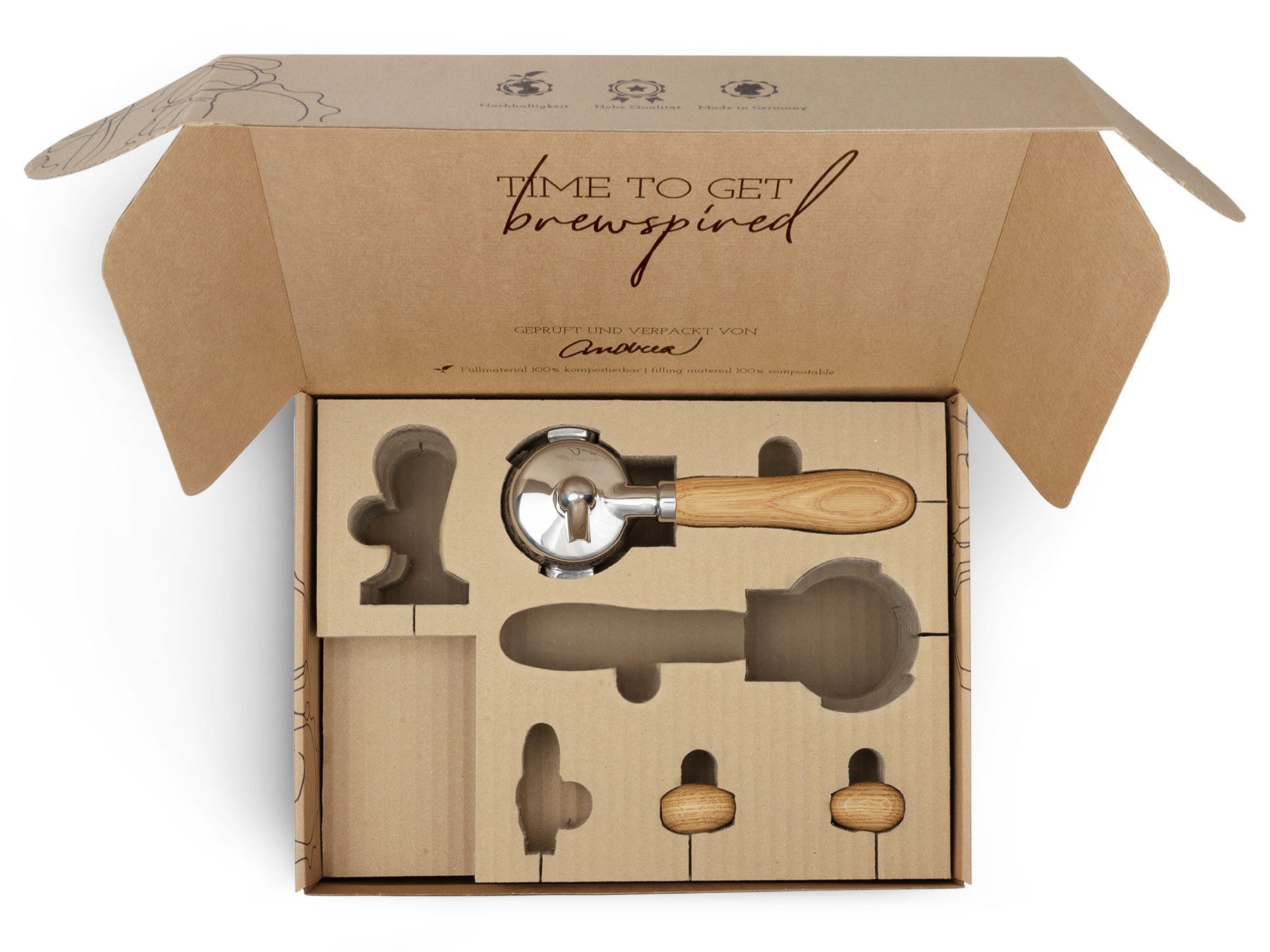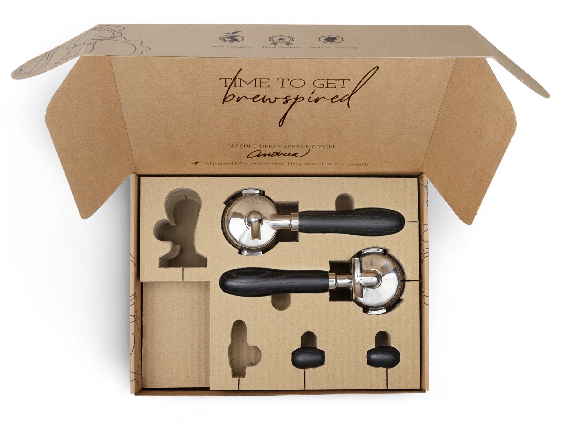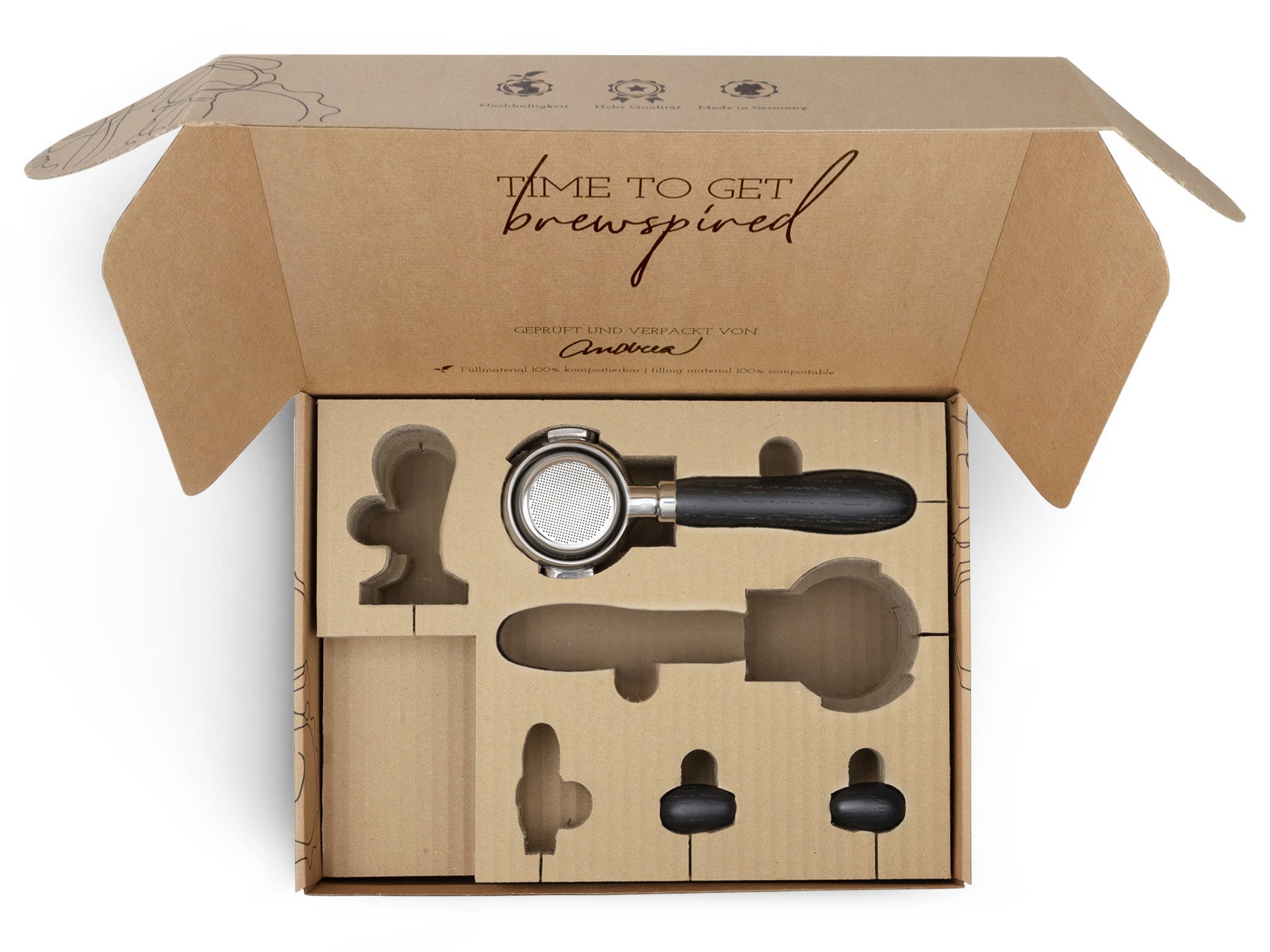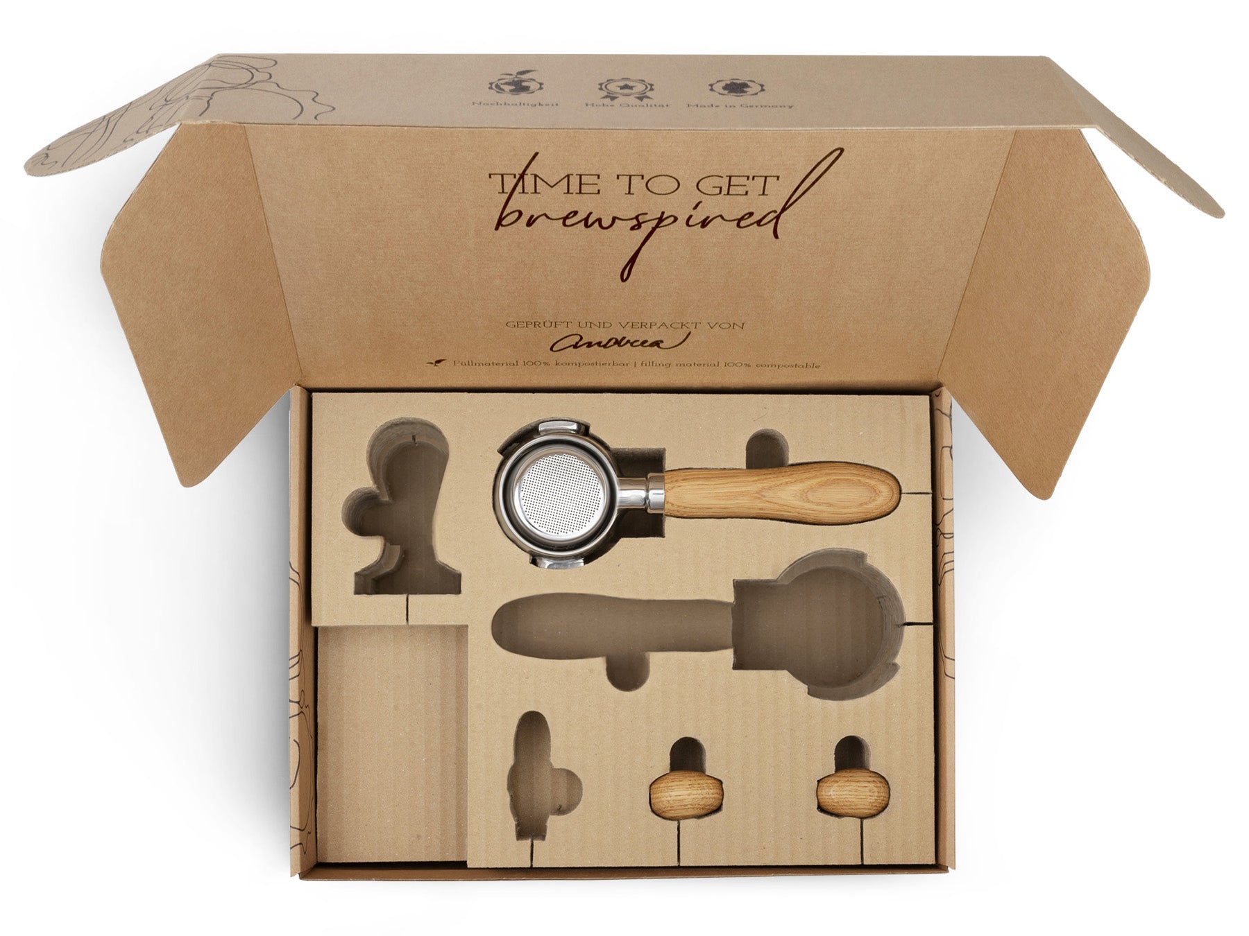 Wir von Brewspire stehen für Kaffee-Genuss mit allen Sinnen. Für viele Heimbaristi zählt die einheitliche Ästhetik der Kaffee-Ecke und das Gefühl der Espressozubereitung genauso dazu, wie der Genuss des Getränks selbst. Mit unseren Veredelungssets verleihst du deiner Siebträger-Espressomaschine den optischen und haptischen Feinschliff, der zu deinen Wünschen passt. Durch die eingelassene Edelstahlbeschwerung liegen unsere Siebträgergriffe angenehm und satt in der Hand. Unsere Veredelungssets sind flexibel erweiterbar: Die Accessoires der Marken Brewspire und eurista sind sprichwörtlich aus dem selben Holz geschnitzt.