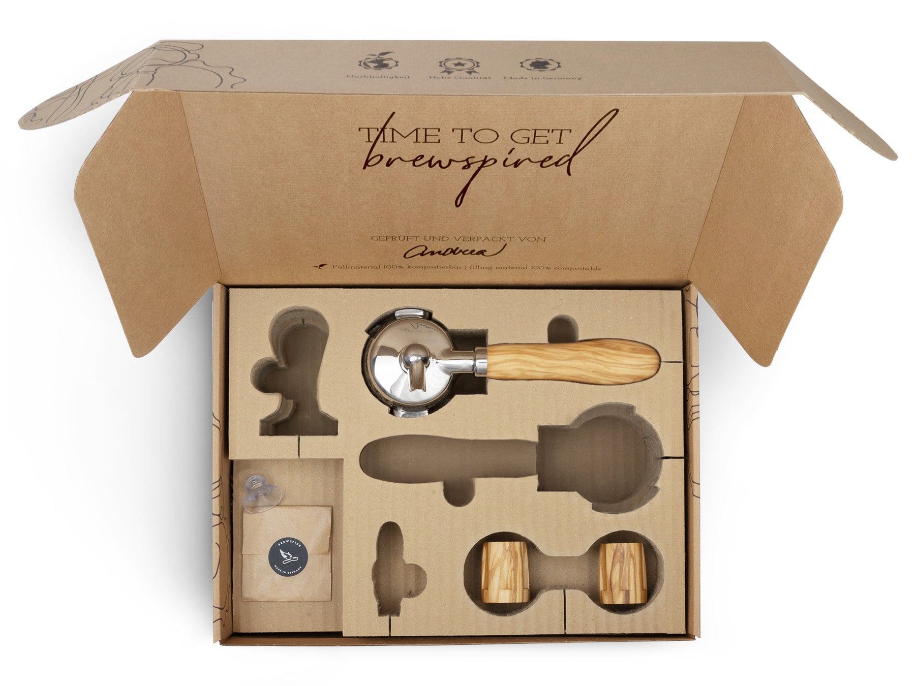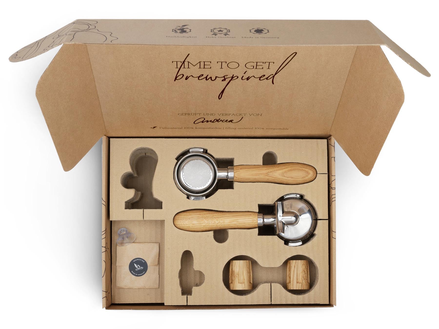 Wir von Brewspire stehen für Kaffee-Genuss mit allen Sinnen. Für viele Heimbaristi zählt die einheitliche Ästhetik der Kaffee-Ecke und das Gefühl der Espressozubereitung genauso dazu, wie der Genuss des Getränks selbst. Mit unseren Veredelungssets verleihst du deiner Siebträger-Espressomaschine den optischen und haptischen Feinschliff, der zu deinen Wünschen passt. Durch die eingelassene Edelstahlbeschwerung liegen unsere Siebträgergriffe angenehm und satt in der Hand. Unsere Veredelungssets sind flexibel erweiterbar: Die Accessoires der Marken Brewspire und eurista sind sprichwörtlich aus dem selben Holz geschnitzt.