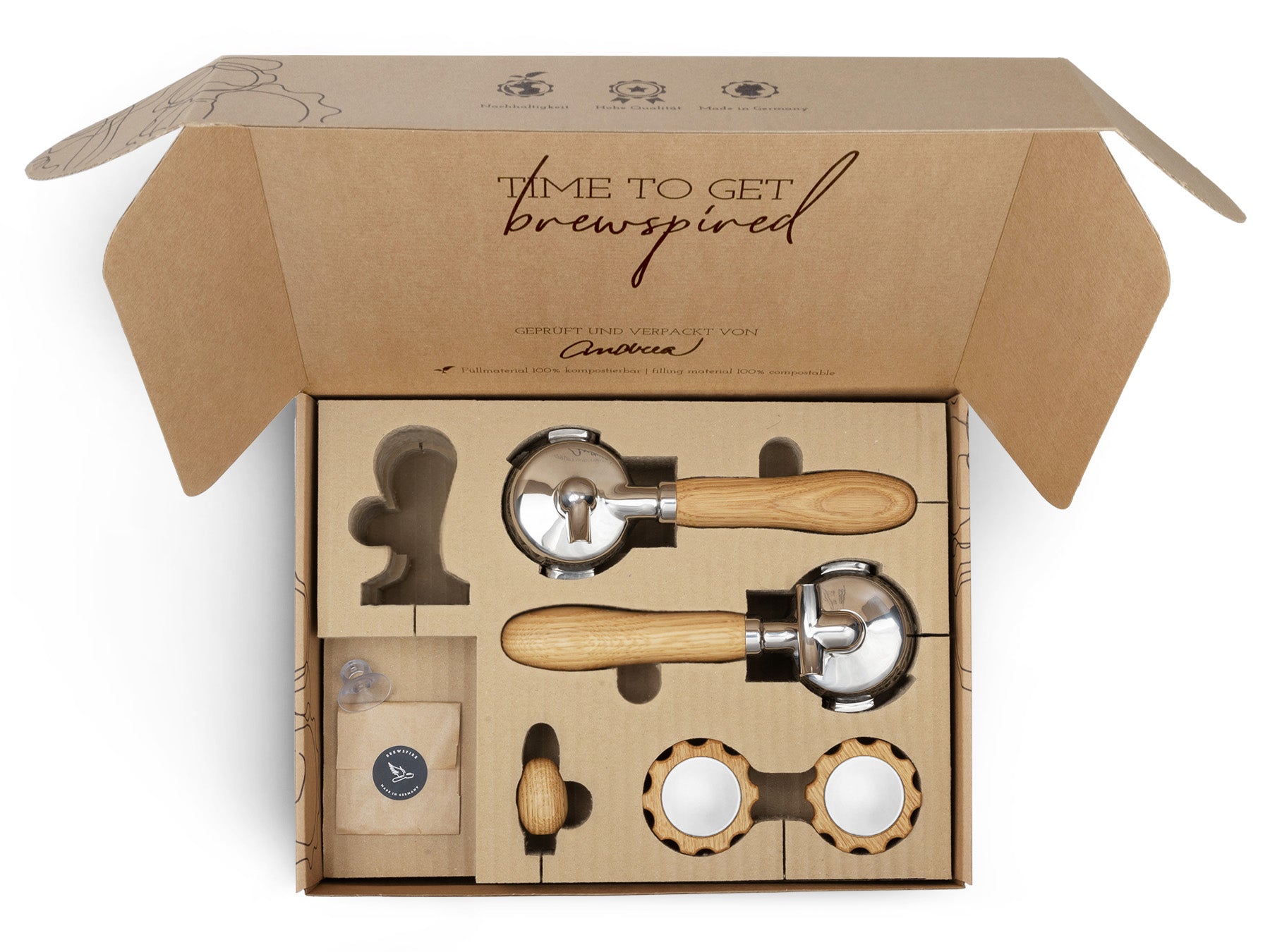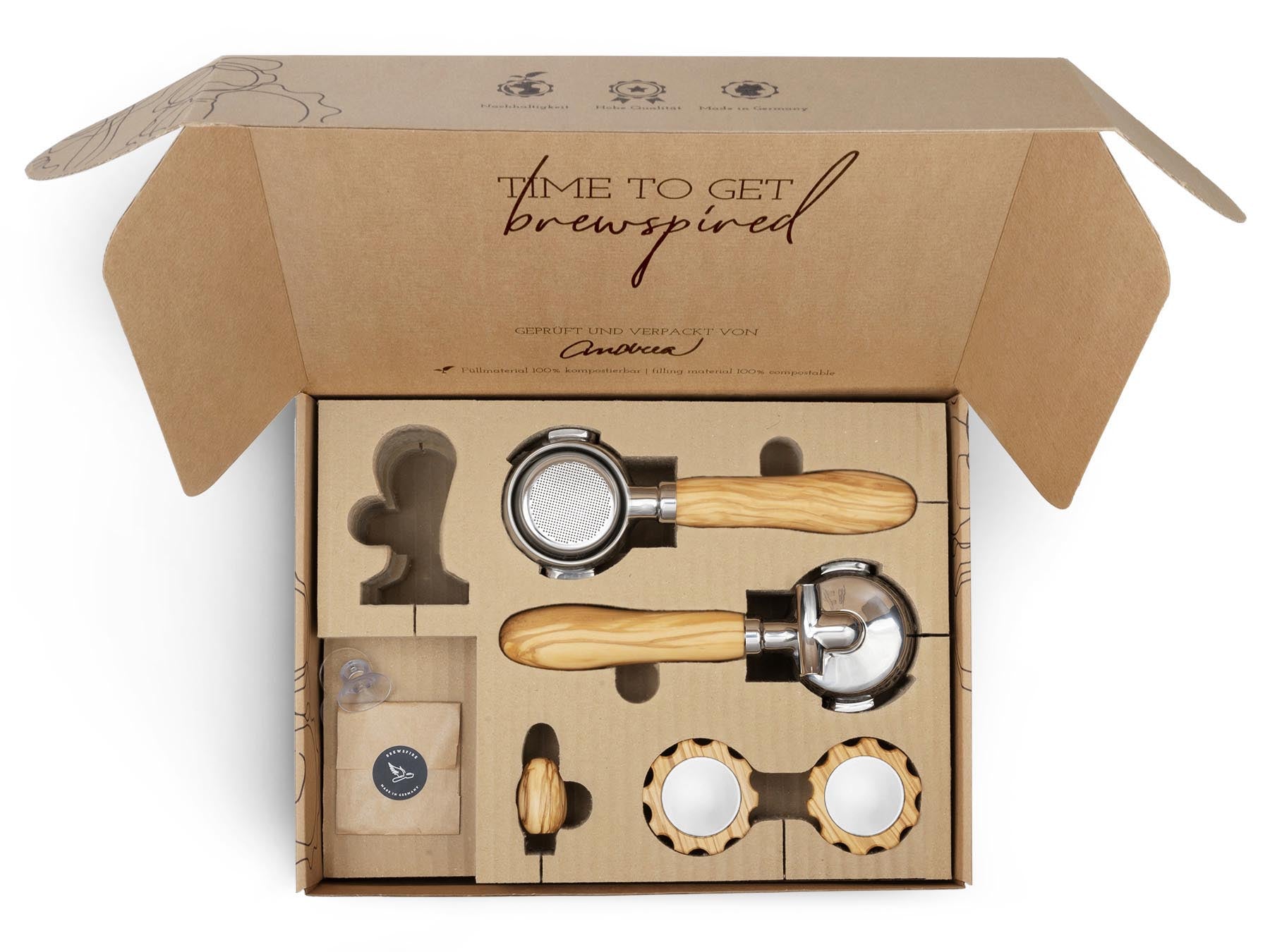 Wir von Brewspire stehen für Kaffee-Genuss mit allen Sinnen. Für viele Heimbaristi zählt die einheitliche Ästhetik der Kaffee-Ecke und das Gefühl der Espressozubereitung genauso dazu, wie der Genuss des Getränks selbst. Mit unseren Veredelungssets verleihst du deiner Siebträger-Espressomaschine den optischen und haptischen Feinschliff, der zu deinen Wünschen passt. Durch die eingelassene Edelstahlbeschwerung liegen unsere Siebträgergriffe angenehm und satt in der Hand. Unsere Veredelungssets sind flexibel erweiterbar: Die Accessoires der Marken Brewspire und eurista sind sprichwörtlich aus dem selben Holz geschnitzt.