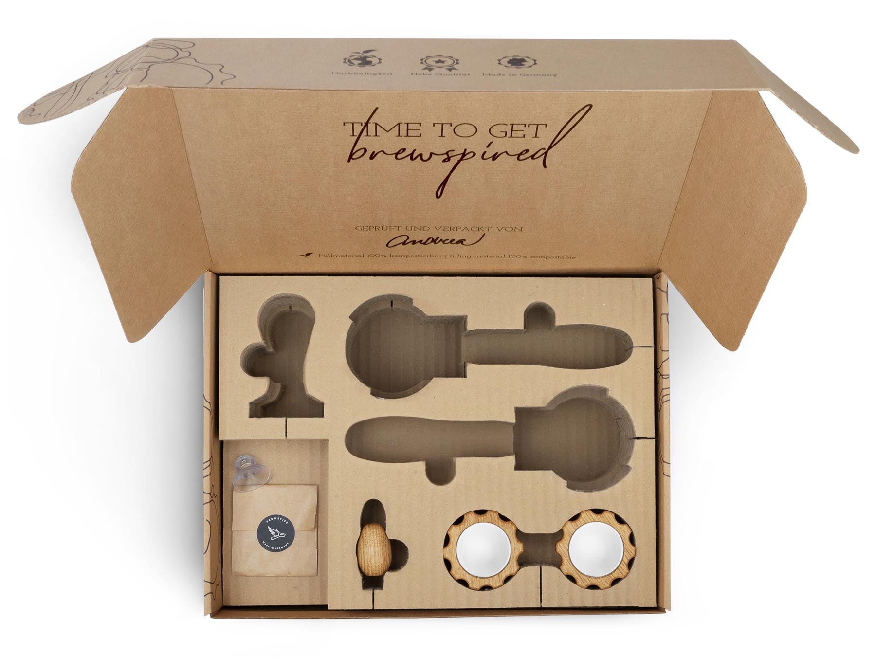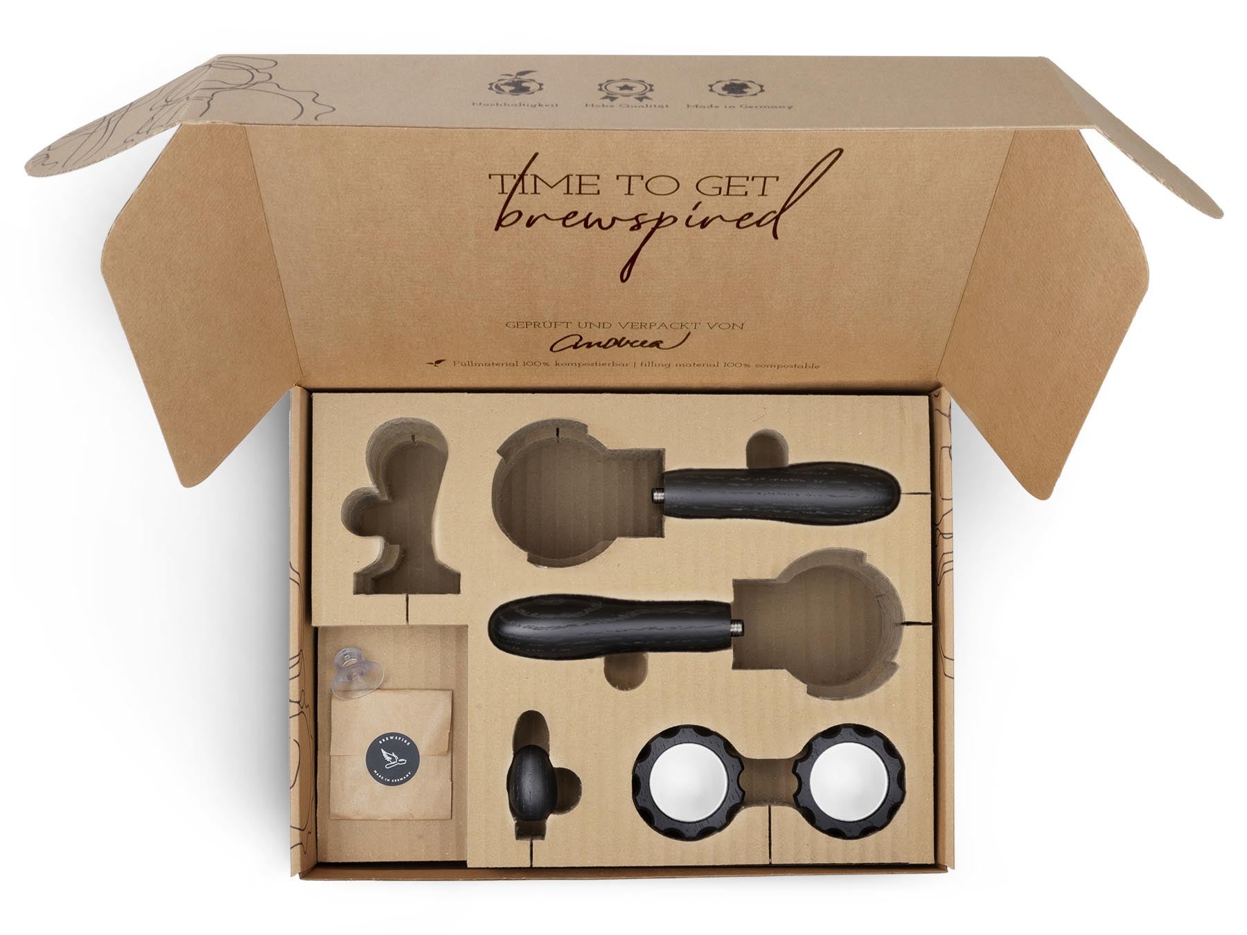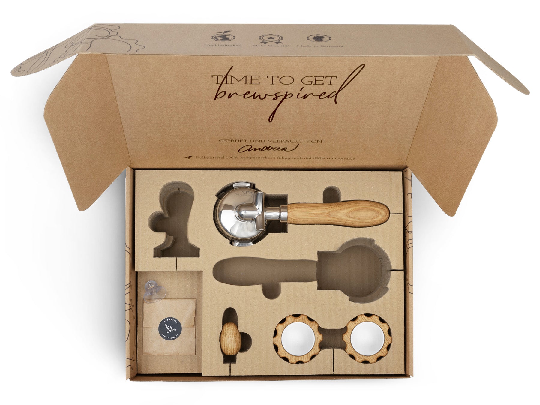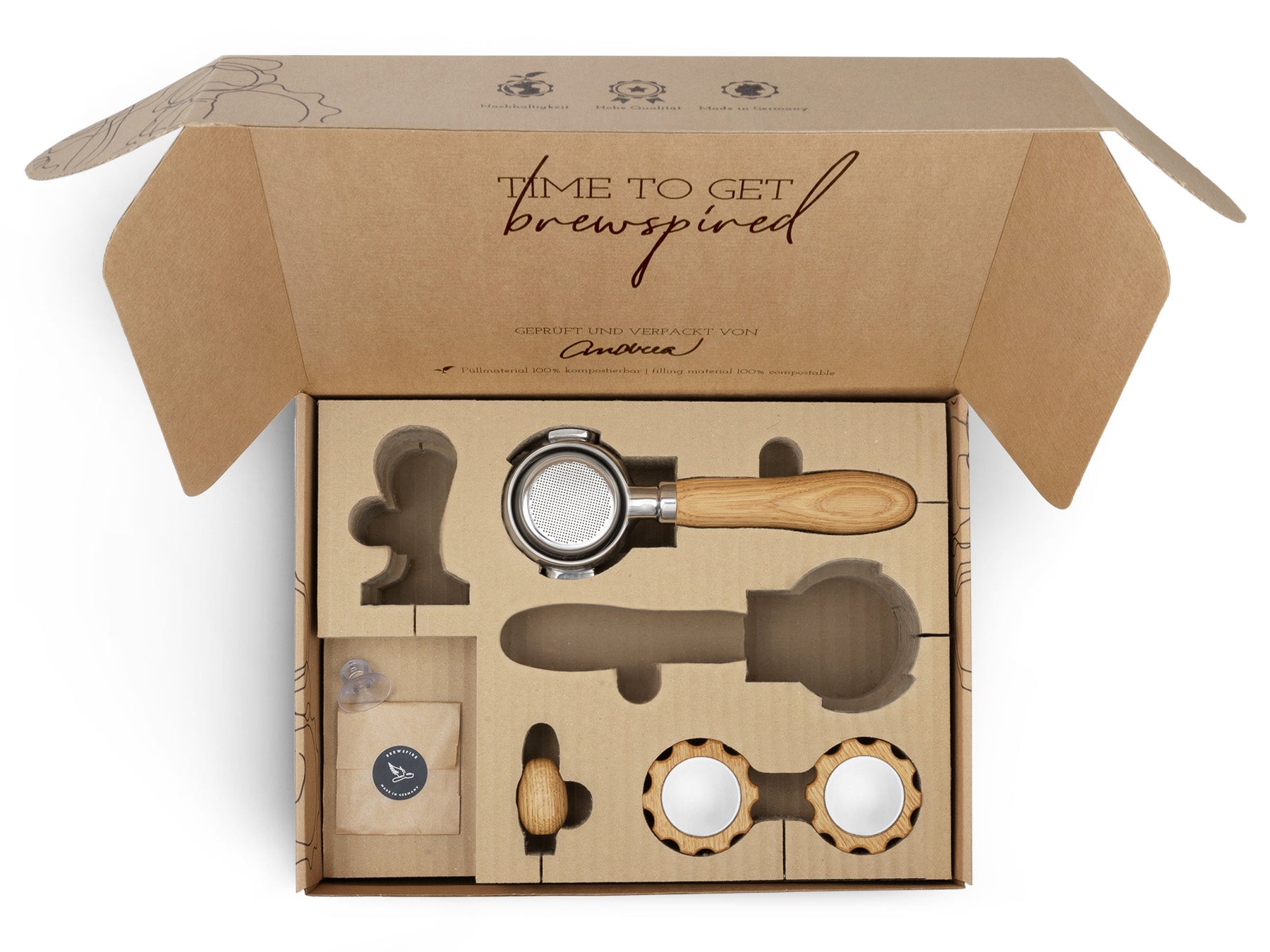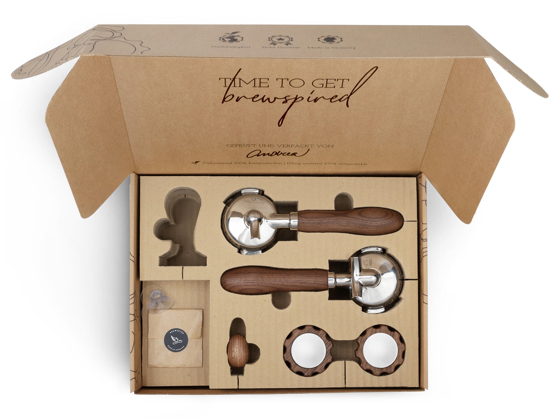 Wir von Brewspire stehen für Kaffee-Genuss mit allen Sinnen. Für viele Heimbaristi zählt die einheitliche Ästhetik der Kaffee-Ecke und das Gefühl der Espressozubereitung genauso dazu, wie der Genuss des Getränks selbst. Mit unseren Veredelungssets verleihst du deiner Siebträger-Espressomaschine den optischen und haptischen Feinschliff, der zu deinen Wünschen passt. Durch die eingelassene Edelstahlbeschwerung liegen unsere Siebträgergriffe angenehm und satt in der Hand. Unsere Veredelungssets sind flexibel erweiterbar: Die Accessoires der Marken Brewspire und eurista sind sprichwörtlich aus dem selben Holz geschnitzt.