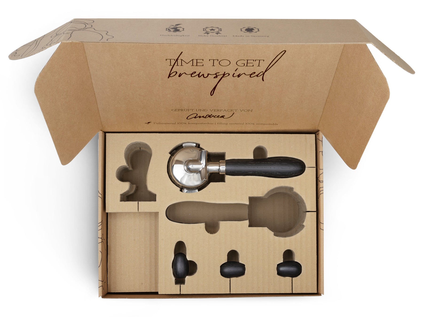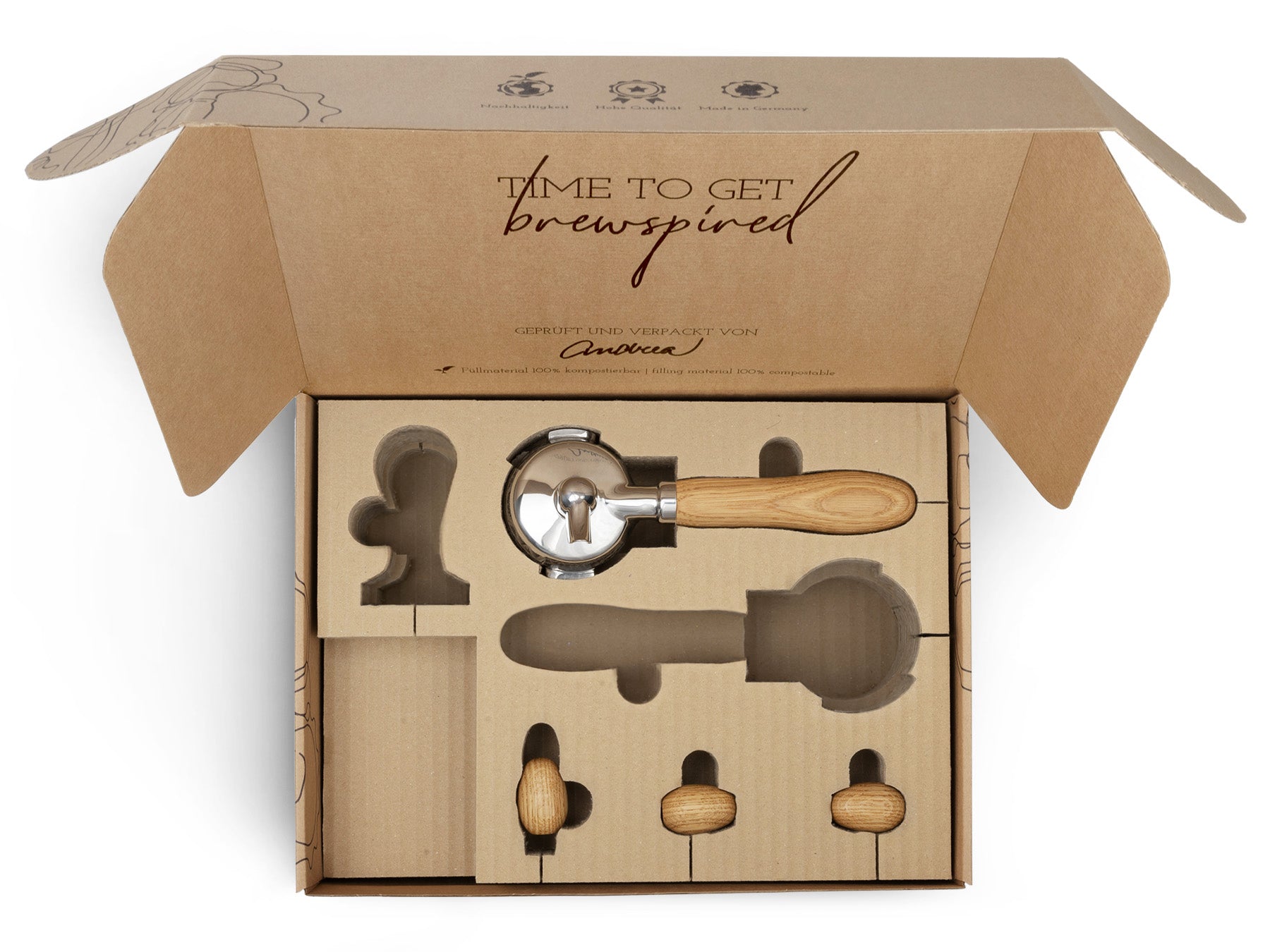 Wir von Brewspire stehen für Kaffee-Genuss mit allen Sinnen. Für viele Heimbaristi zählt die einheitliche Ästhetik der Kaffee-Ecke und das Gefühl der Espressozubereitung genauso dazu, wie der Genuss des Getränks selbst. Mit unseren Veredelungssets verleihst du deiner Siebträger-Espressomaschine den optischen und haptischen Feinschliff, der zu deinen Wünschen passt. Durch die eingelassene Edelstahlbeschwerung liegen unsere Siebträgergriffe angenehm und satt in der Hand. Unsere Veredelungssets sind flexibel erweiterbar: Die Accessoires der Marken Brewspire und eurista sind sprichwörtlich aus dem selben Holz geschnitzt.
