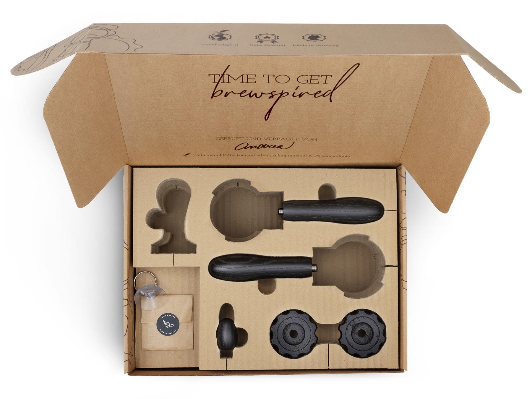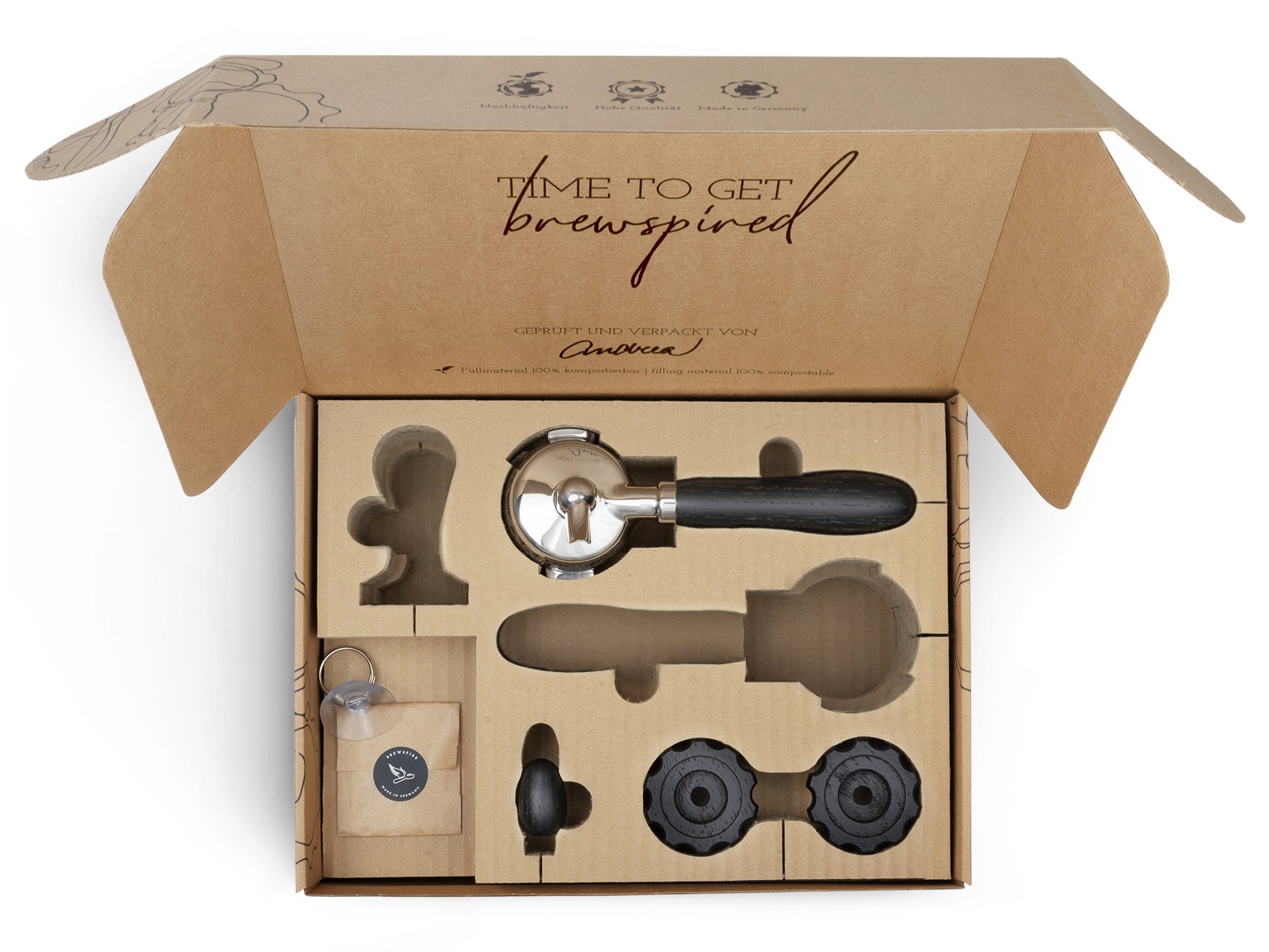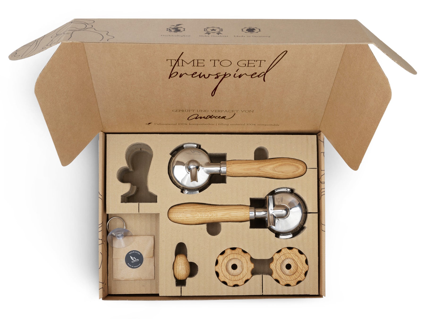 Wir von Brewspire stehen für Kaffee-Genuss mit allen Sinnen. Für viele Heimbaristi zählt die einheitliche Ästhetik der Kaffee-Ecke und das Gefühl der Espressozubereitung genauso dazu, wie der Genuss des Getränks selbst. Mit unseren Veredelungssets verleihst du deiner Siebträger-Espressomaschine den optischen und haptischen Feinschliff, der zu deinen Wünschen passt. Durch die eingelassene Edelstahlbeschwerung liegen unsere Siebträgergriffe angenehm und satt in der Hand. Unsere Veredelungssets sind flexibel erweiterbar: Die Accessoires der Marken Brewspire und eurista sind sprichwörtlich aus dem selben Holz geschnitzt.