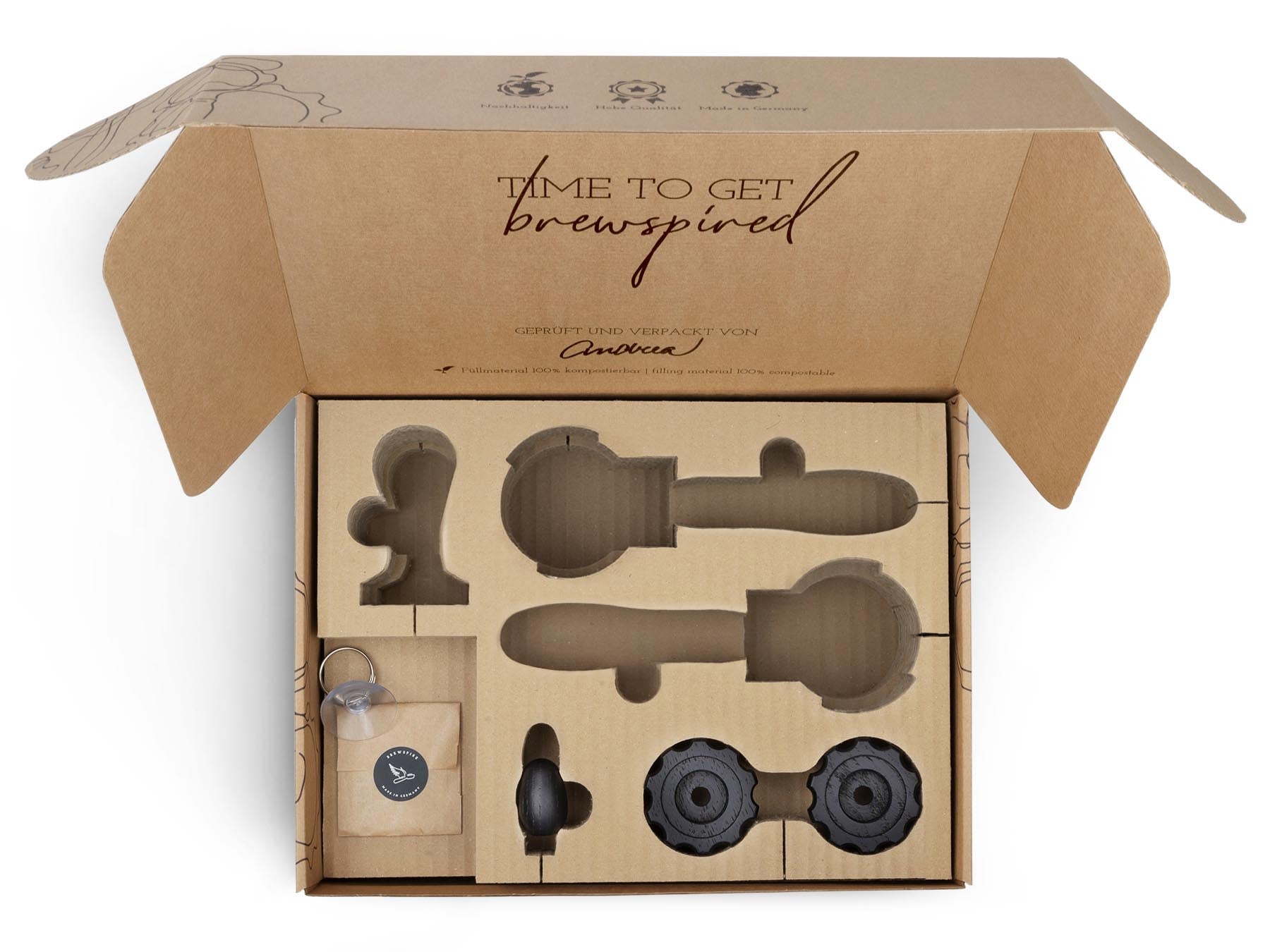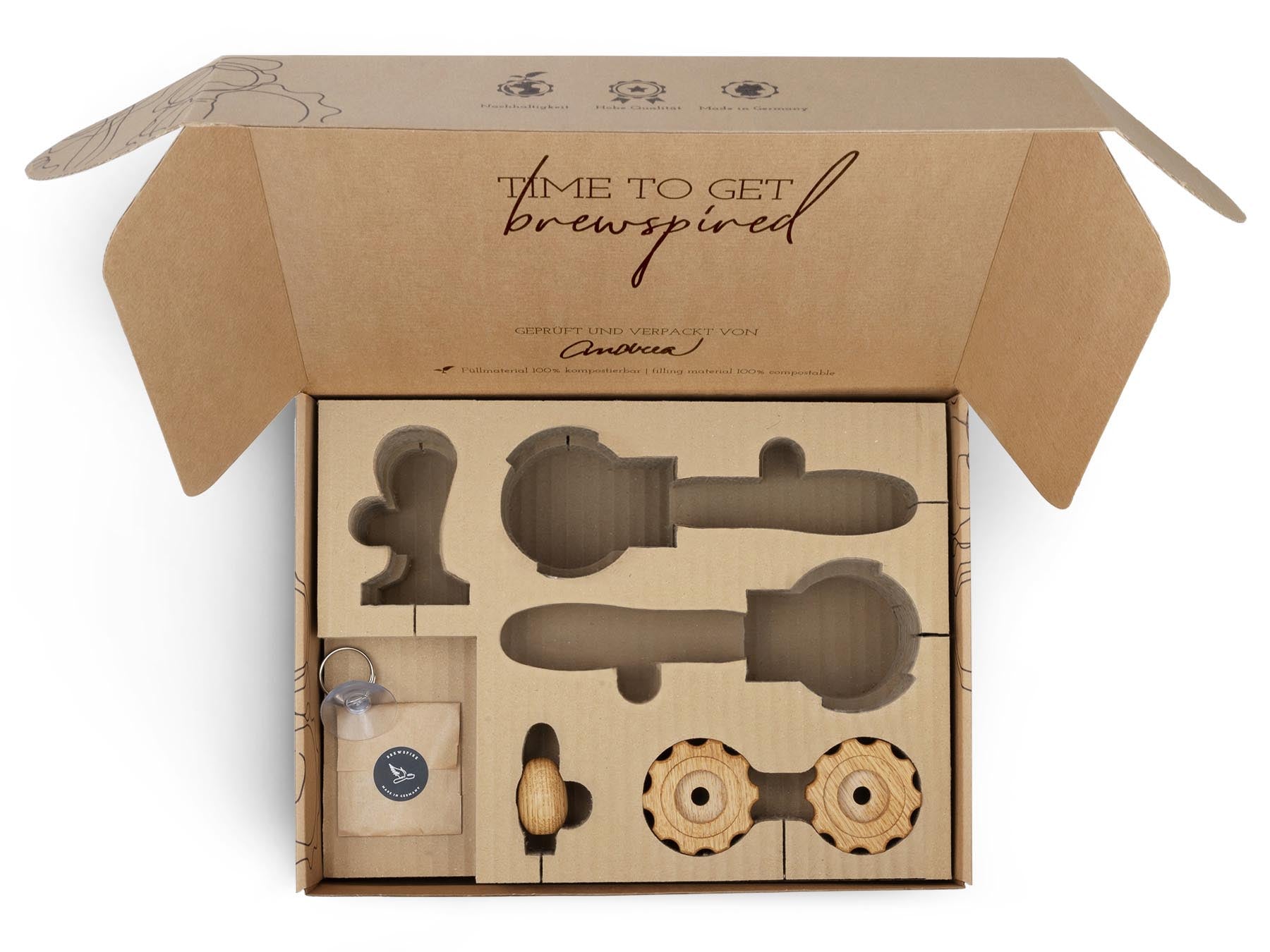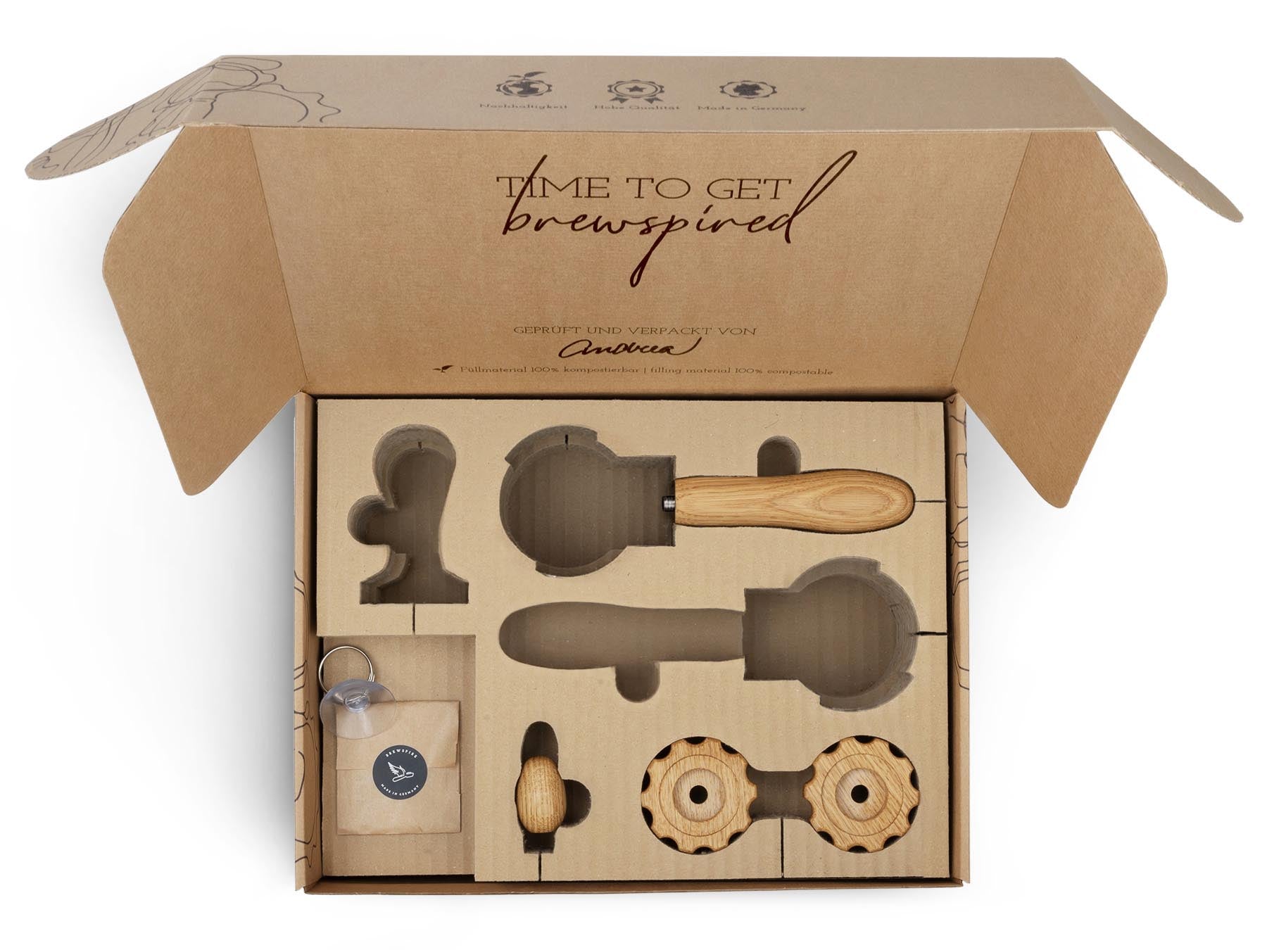 Wir von Brewspire stehen für Kaffee-Genuss mit allen Sinnen. Für viele Heimbaristi zählt die einheitliche Ästhetik der Kaffee-Ecke und das Gefühl der Espressozubereitung genauso dazu, wie der Genuss des Getränks selbst. Mit unseren Veredelungssets verleihst du deiner Siebträger-Espressomaschine den optischen und haptischen Feinschliff, der zu deinen Wünschen passt. Durch die eingelassene Edelstahlbeschwerung liegen unsere Siebträgergriffe angenehm und satt in der Hand. Unsere Veredelungssets sind flexibel erweiterbar: Die Accessoires der Marken Brewspire und eurista sind sprichwörtlich aus dem selben Holz geschnitzt.