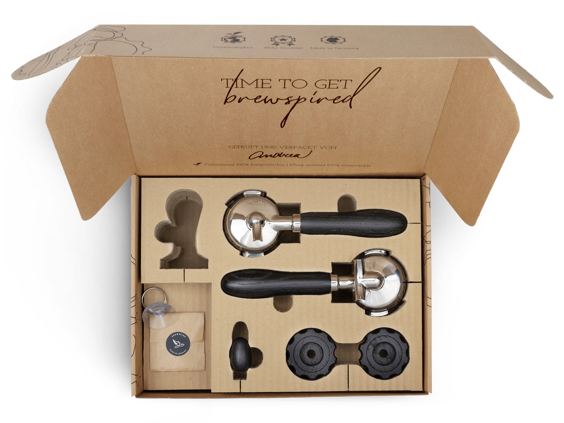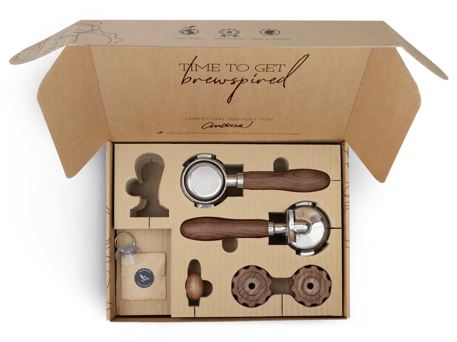 Wir von Brewspire stehen für Kaffee-Genuss mit allen Sinnen. Für viele Heimbaristi zählt die einheitliche Ästhetik der Kaffee-Ecke und das Gefühl der Espressozubereitung genauso dazu, wie der Genuss des Getränks selbst. Mit unseren Veredelungssets verleihst du deiner Siebträger-Espressomaschine den optischen und haptischen Feinschliff, der zu deinen Wünschen passt. Durch die eingelassene Edelstahlbeschwerung liegen unsere Siebträgergriffe angenehm und satt in der Hand. Unsere Veredelungssets sind flexibel erweiterbar: Die Accessoires der Marken Brewspire und eurista sind sprichwörtlich aus dem selben Holz geschnitzt.