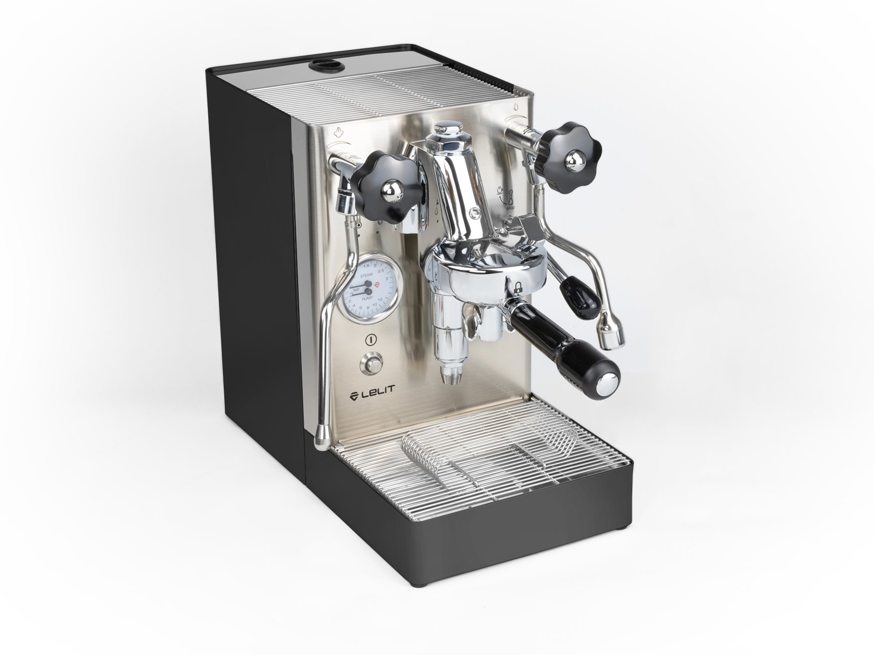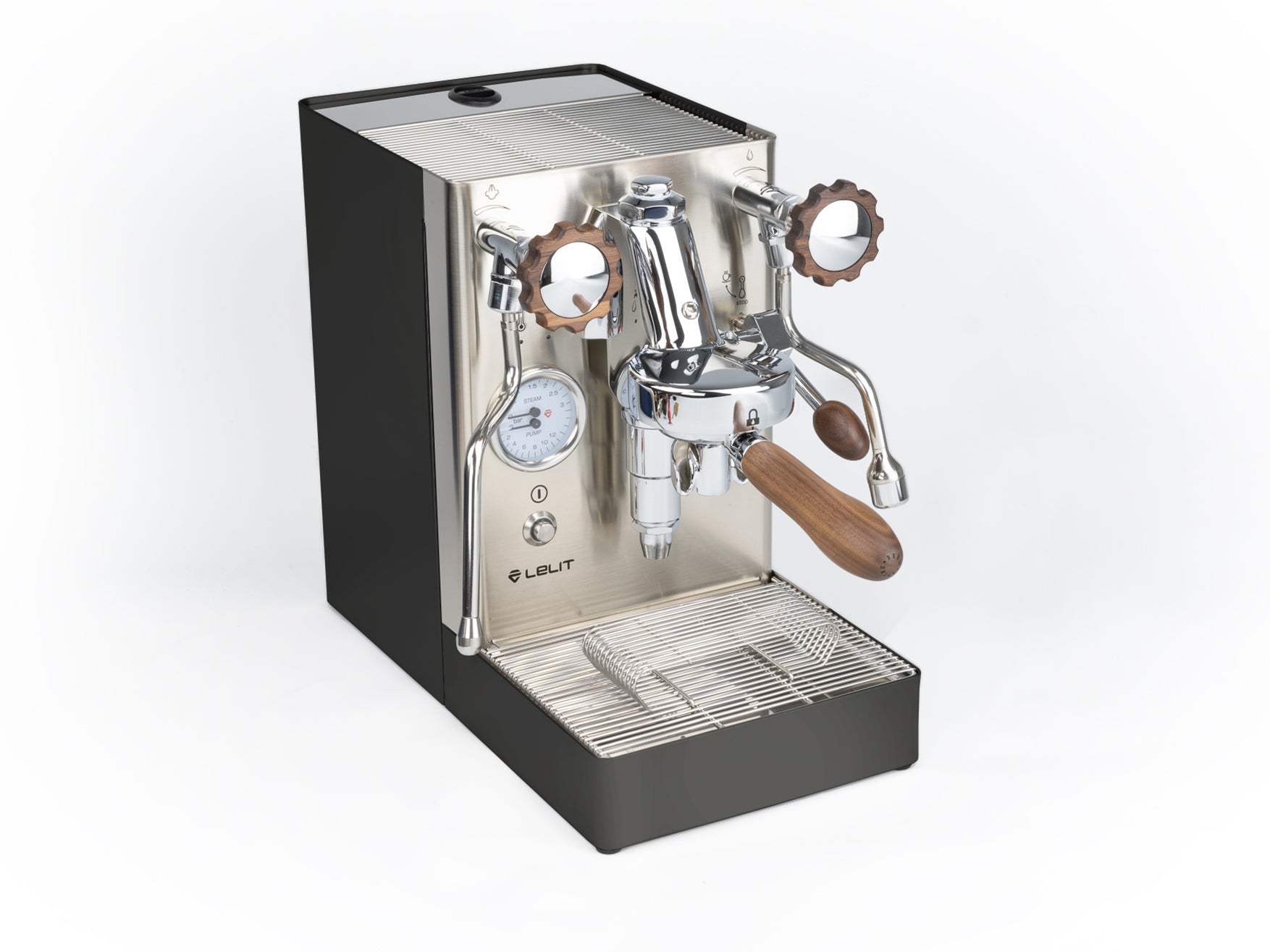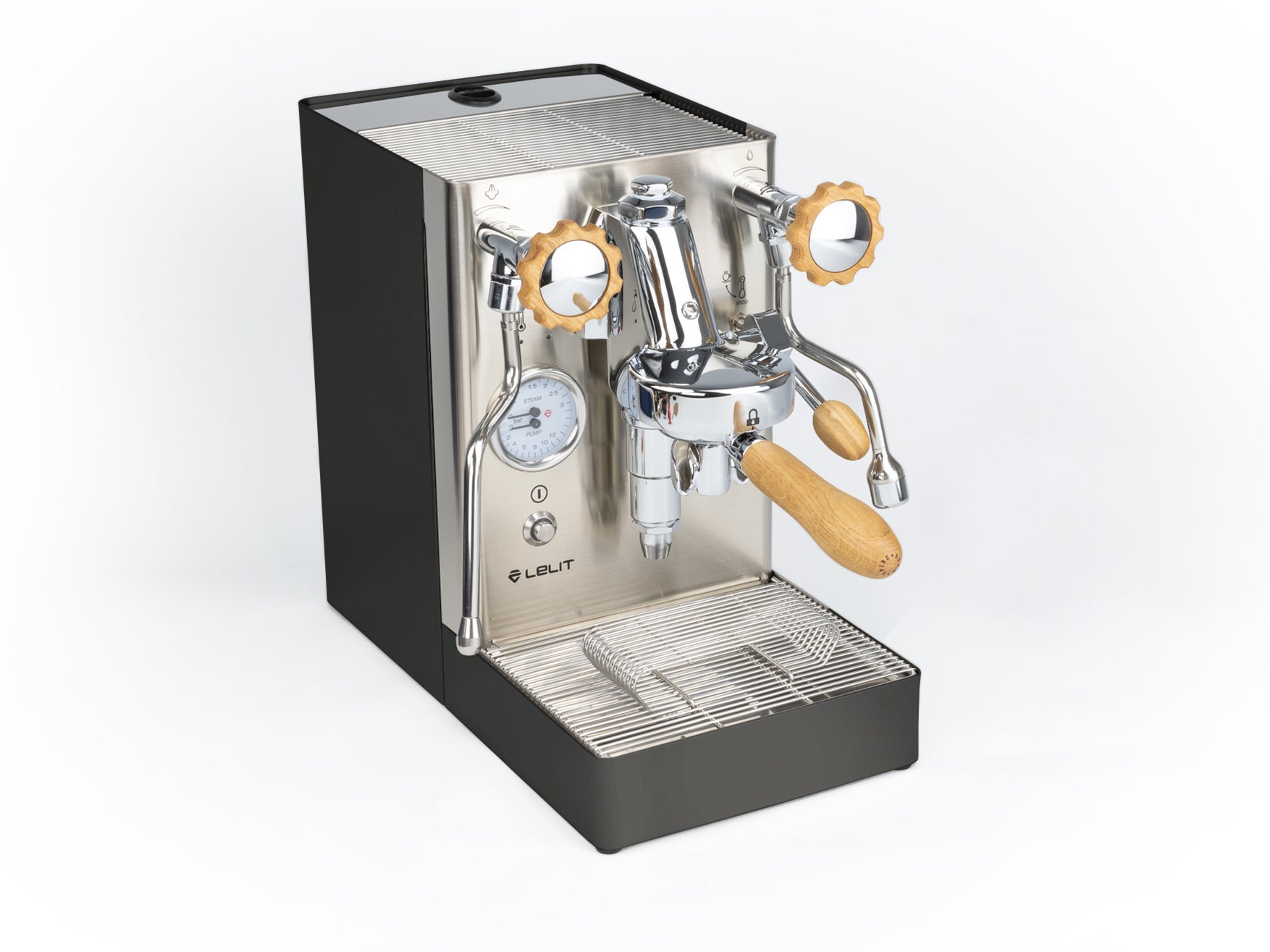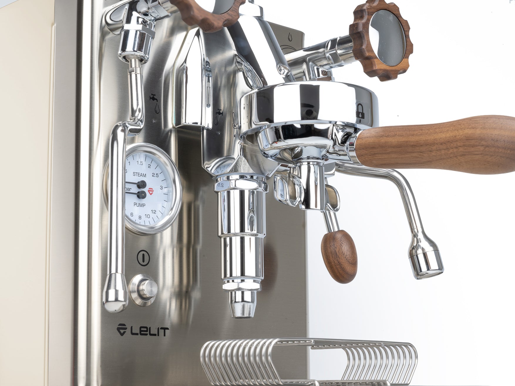 Das Gehäuse aus satiniertem Edelstahl hebt die verchromten Elemente hervor und verleiht der Maschine einen eleganten Look. Einzigartig ist der originale Siebträger von Lelit, dessen Ausläufe den Espresso nicht seitlich, sondern direkt von vorne in die Tasse leiten.