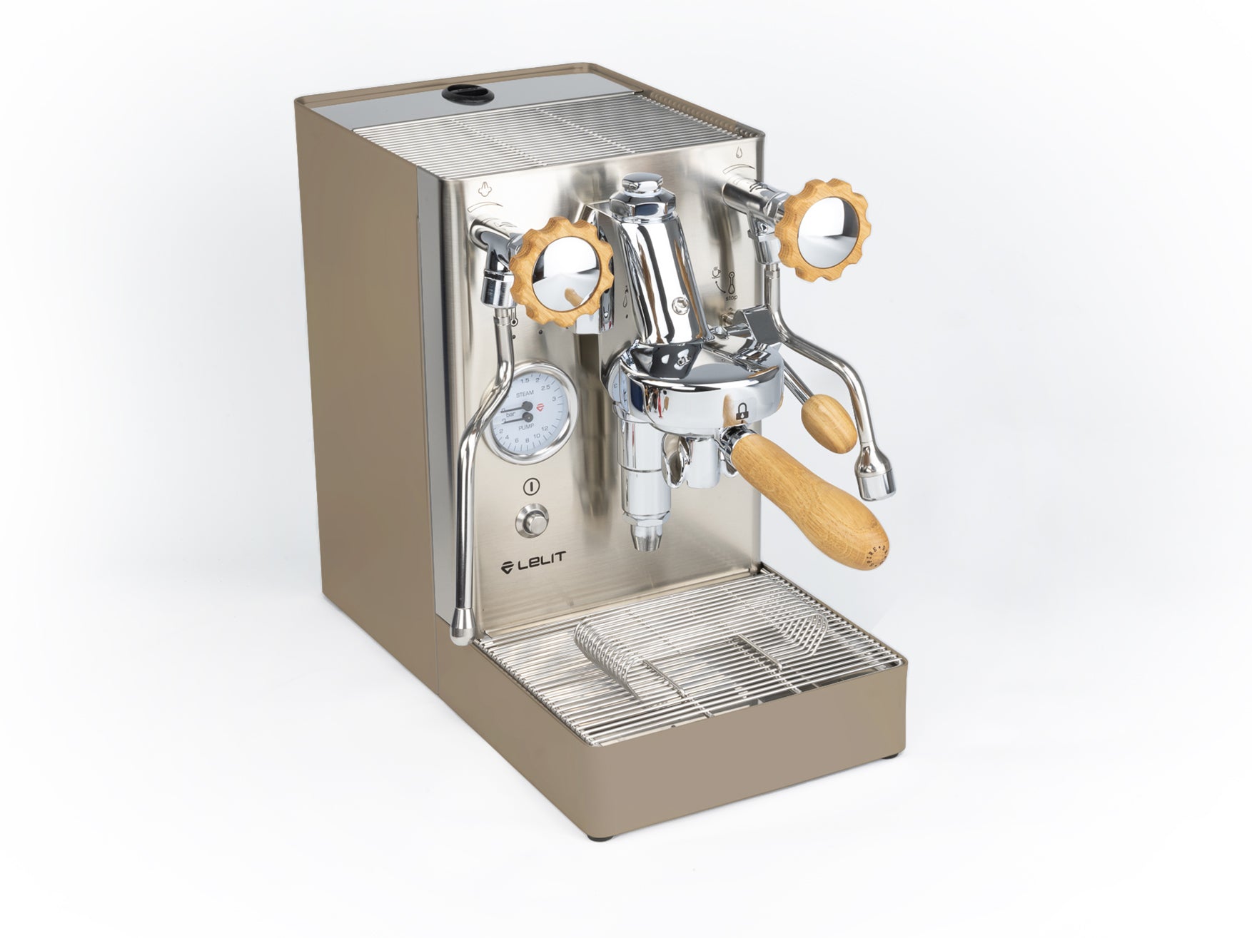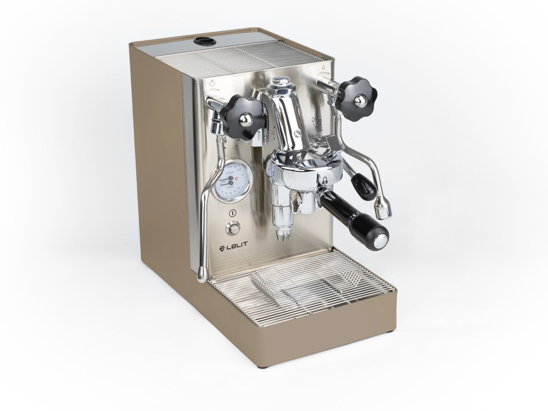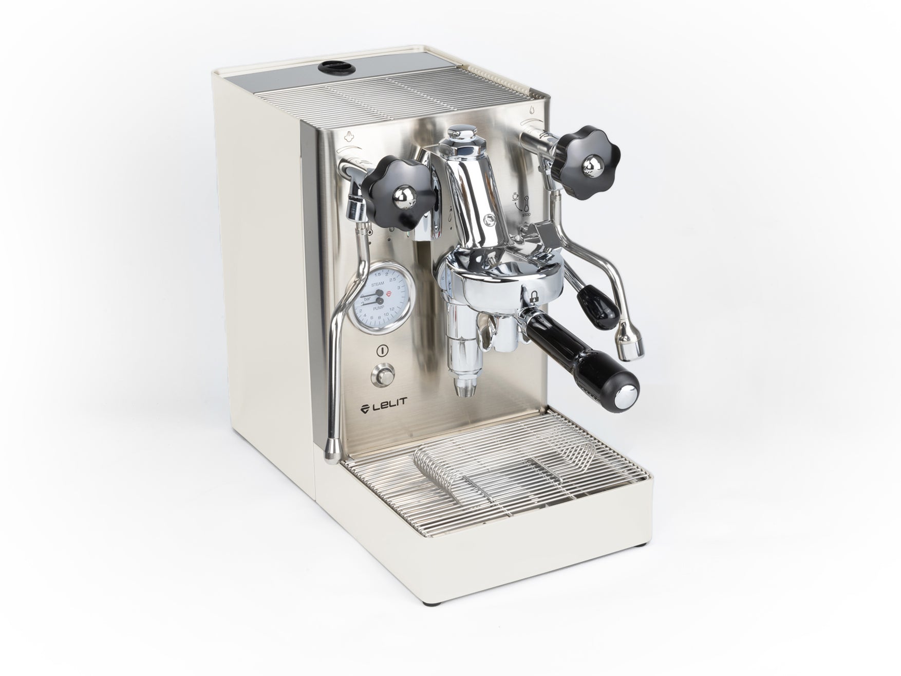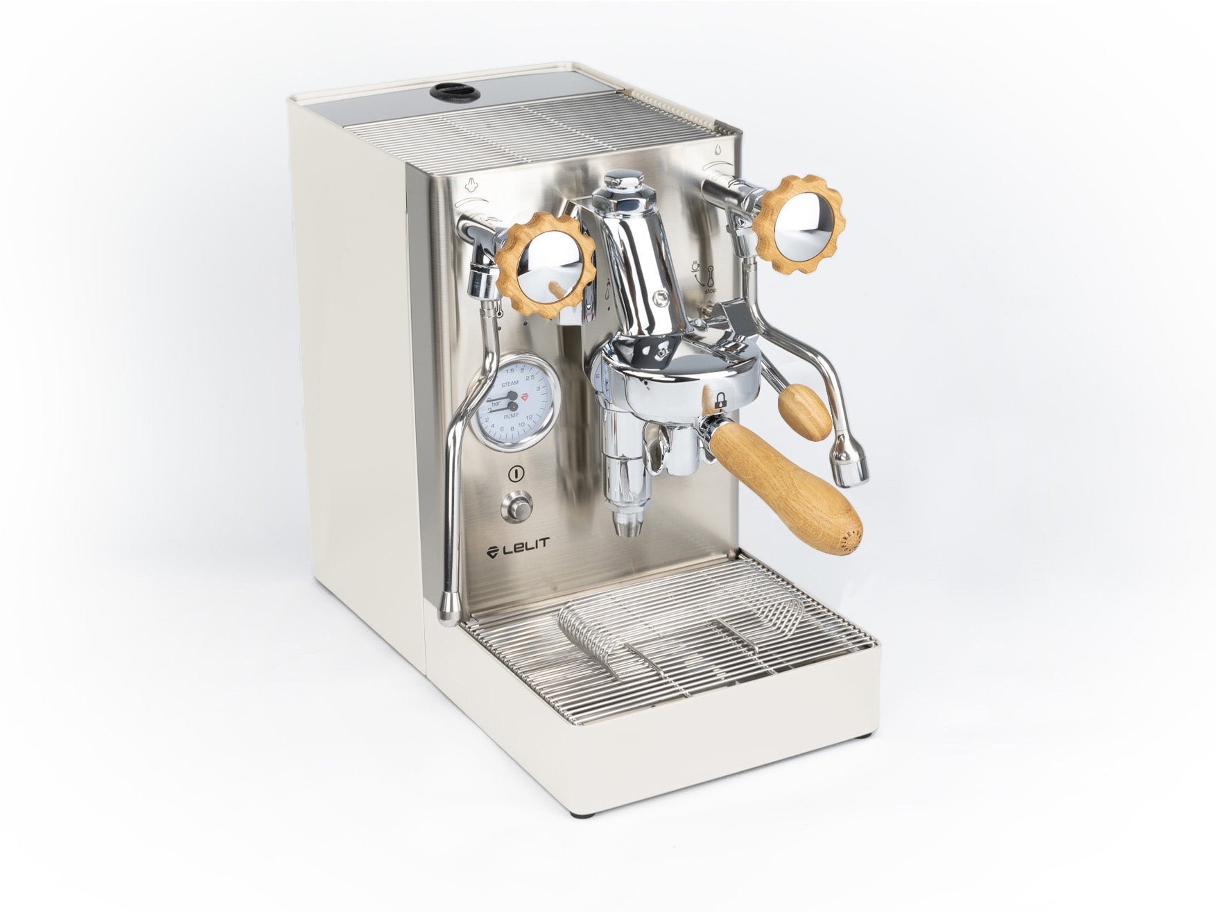 Das Gehäuse aus satiniertem Edelstahl hebt die verchromten Elemente hervor und verleiht der Maschine einen eleganten Look. Einzigartig ist der originale Siebträger von Lelit, dessen Ausläufe den Espresso nicht seitlich, sondern direkt von vorne in die Tasse leiten.