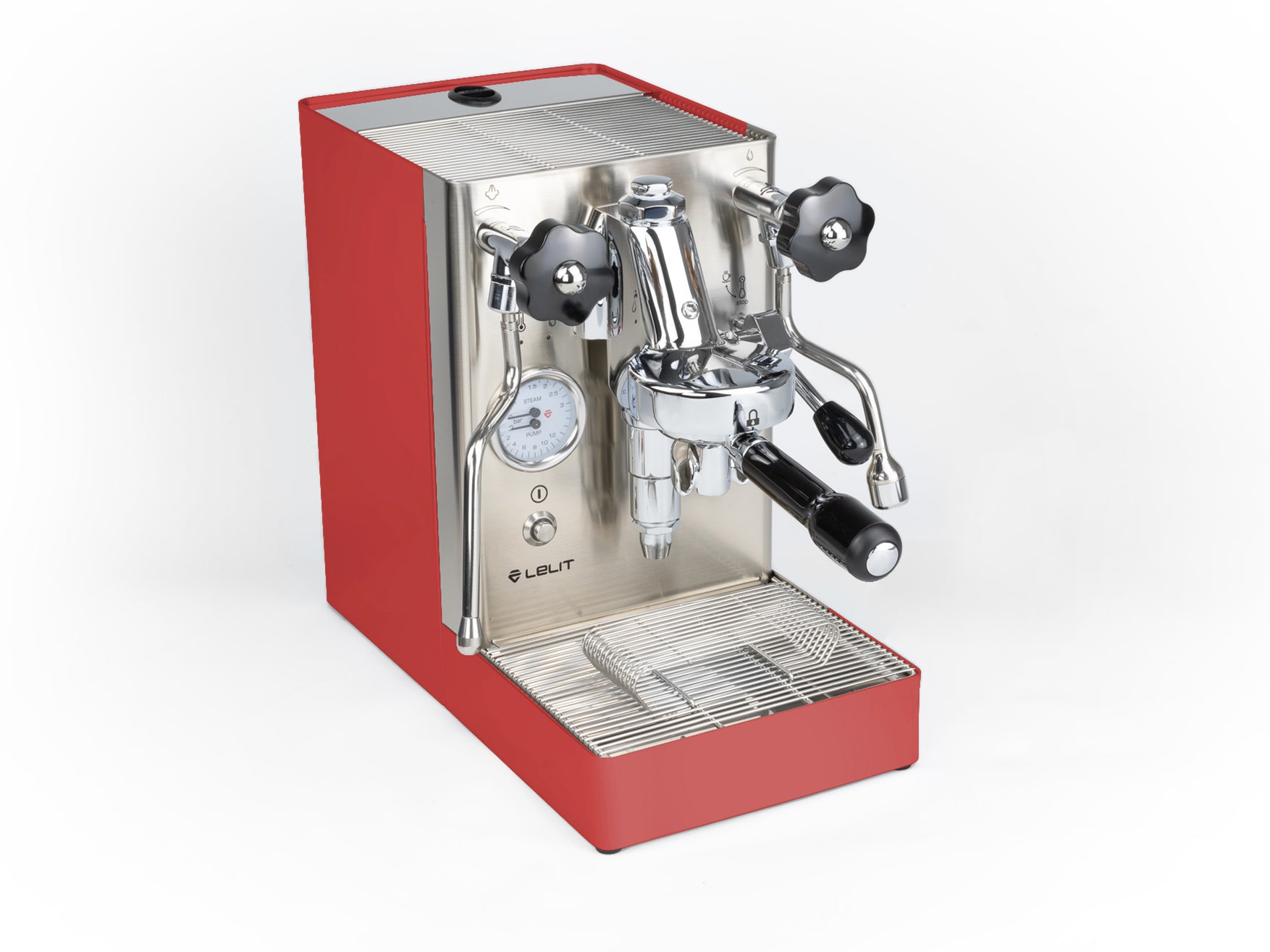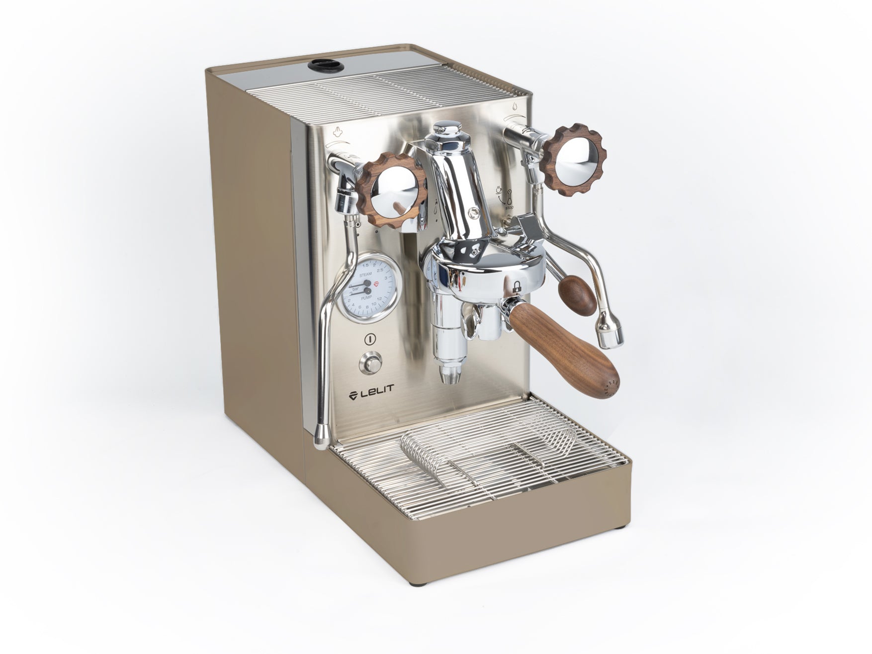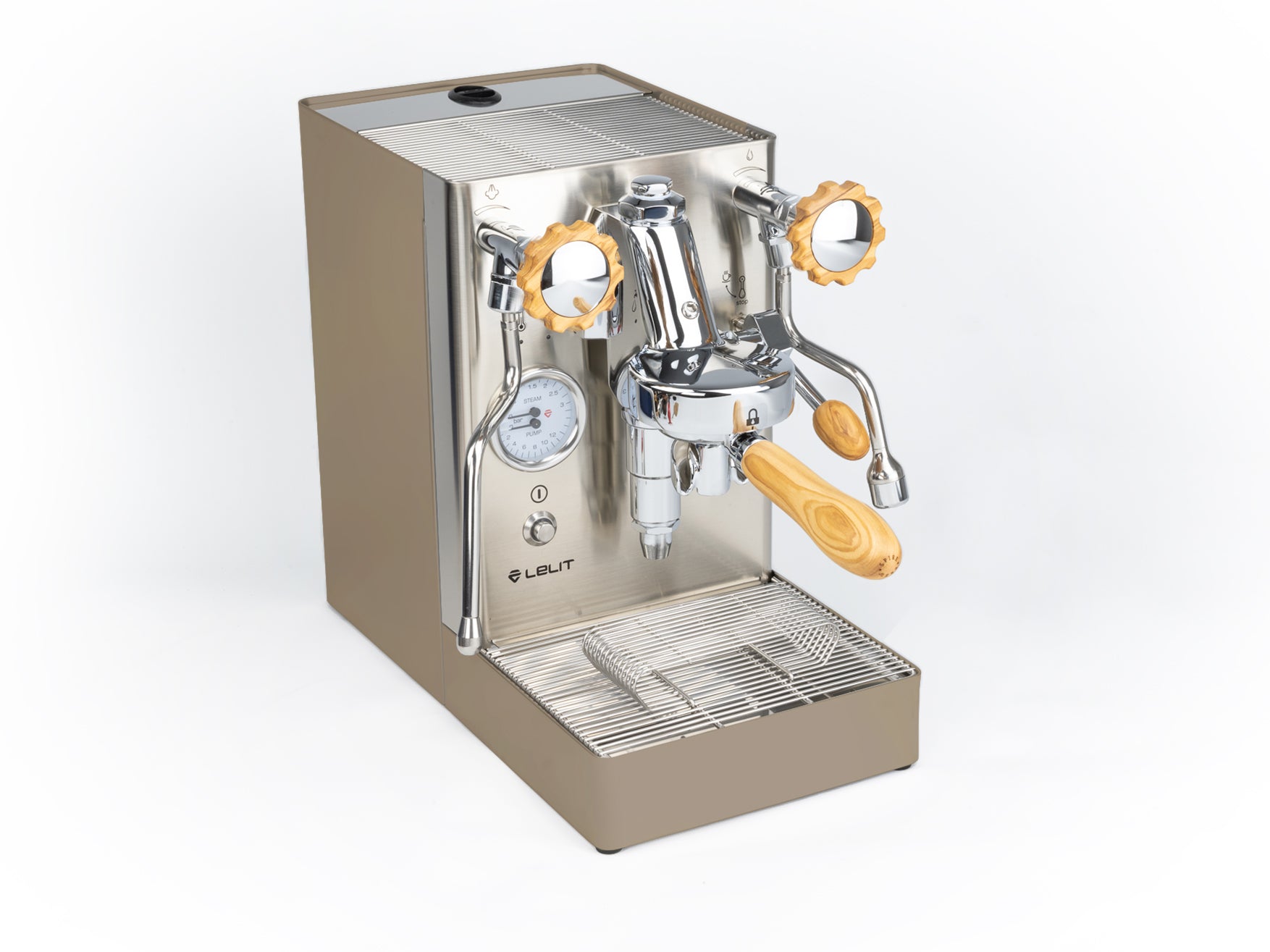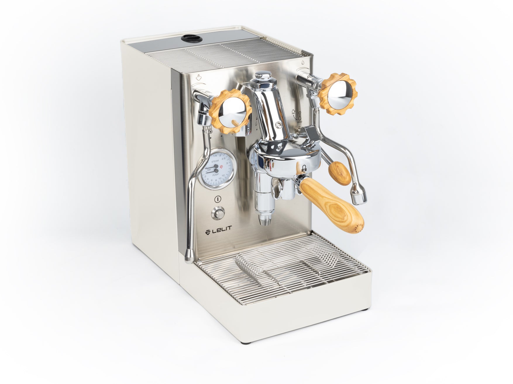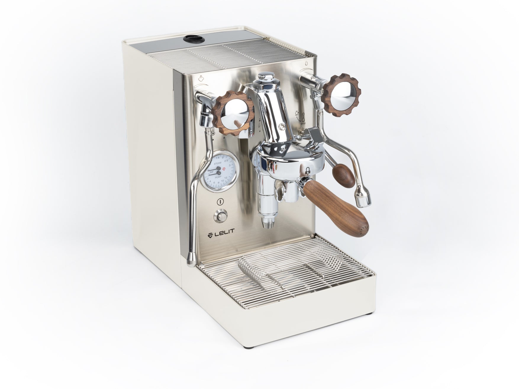 Das Gehäuse aus satiniertem Edelstahl hebt die verchromten Elemente hervor und verleiht der Maschine einen eleganten Look. Einzigartig ist der originale Siebträger von Lelit, dessen Ausläufe den Espresso nicht seitlich, sondern direkt von vorne in die Tasse leiten.