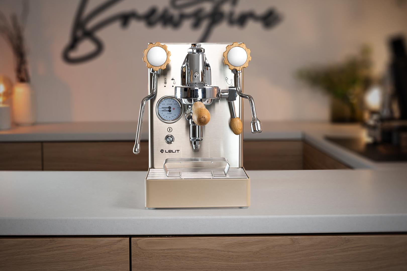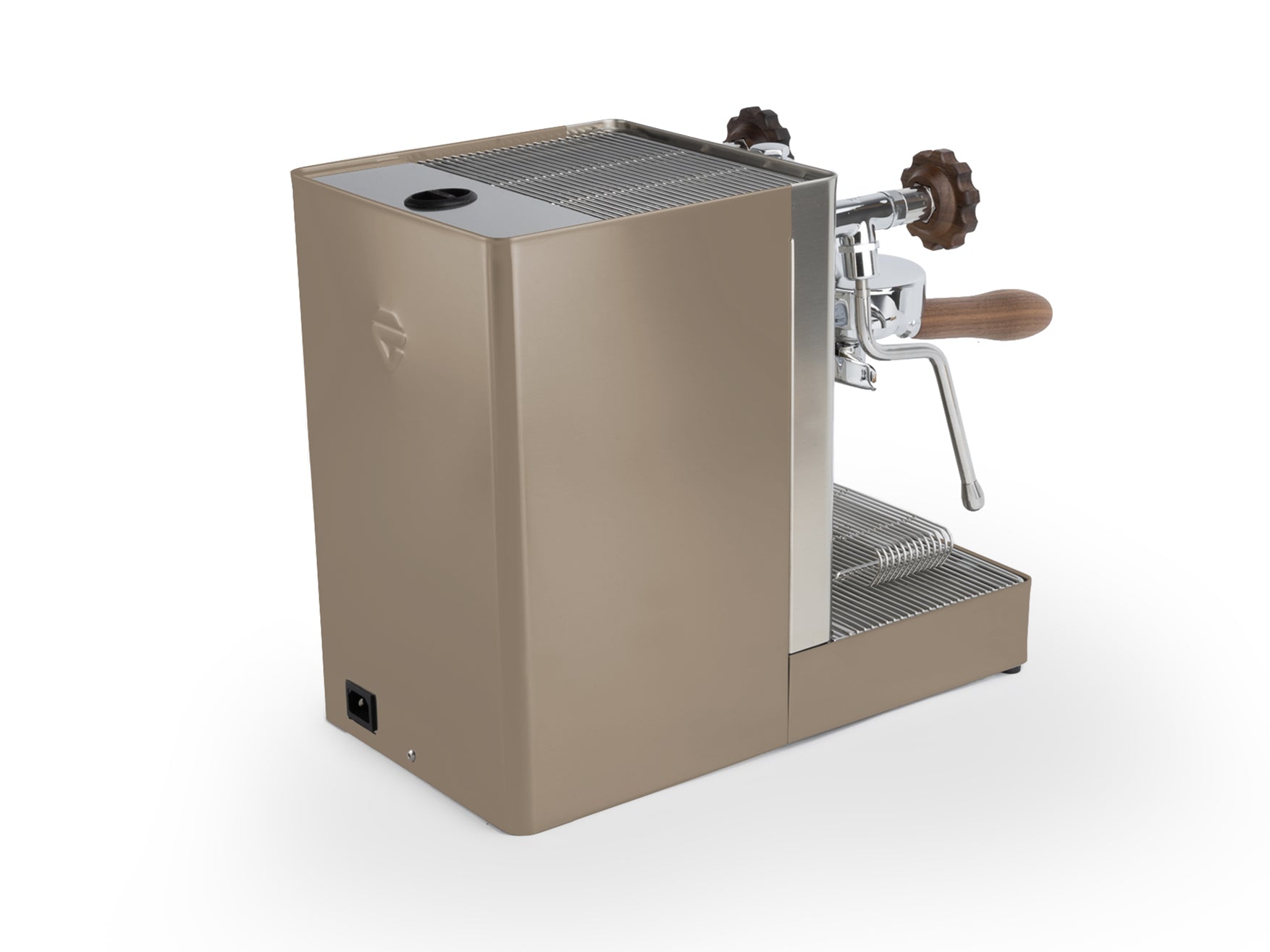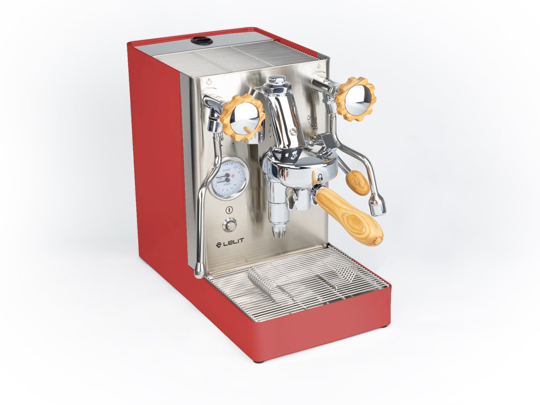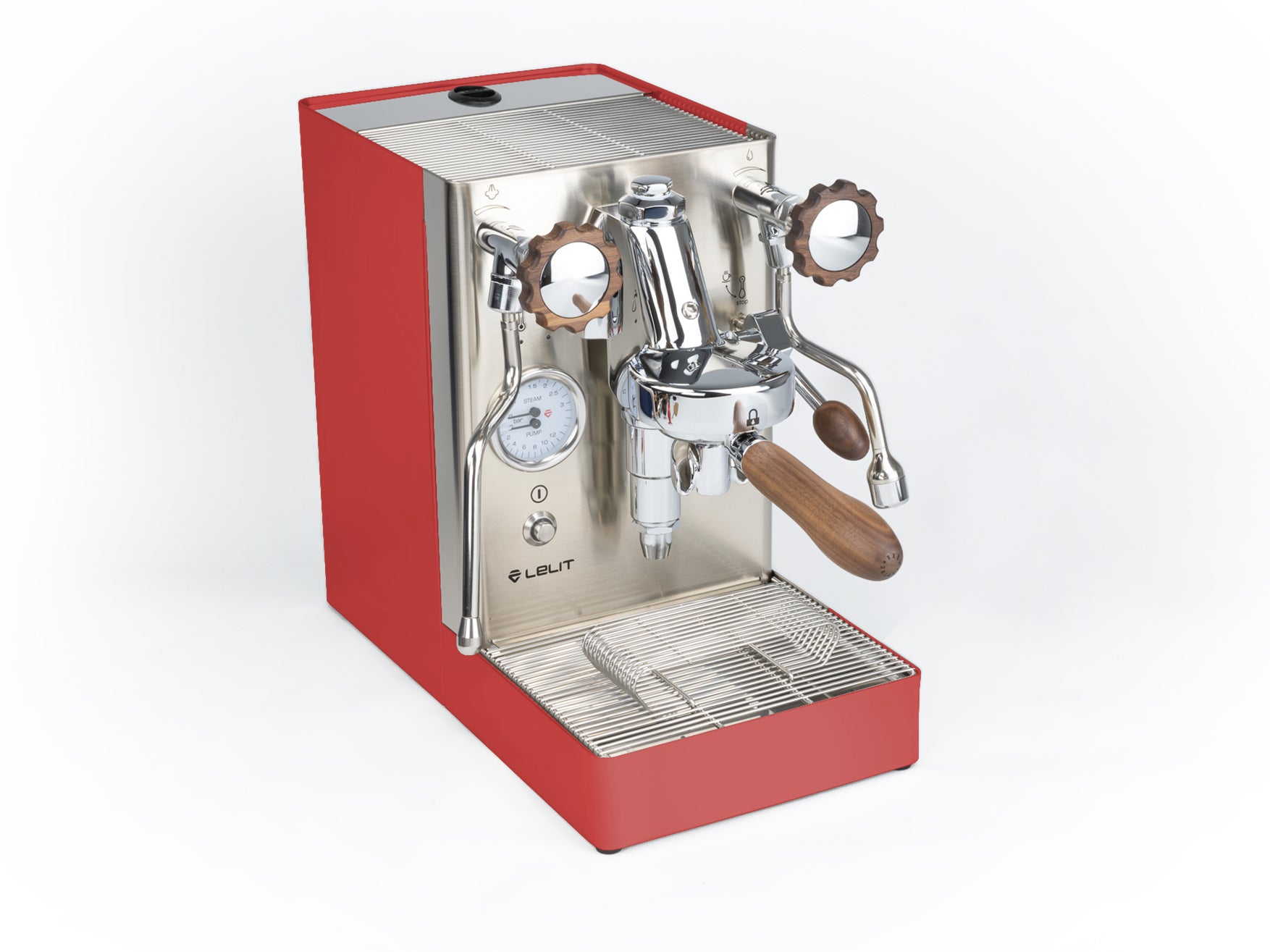 Das Gehäuse aus satiniertem Edelstahl hebt die verchromten Elemente hervor und verleiht der Maschine einen eleganten Look. Einzigartig ist der originale Siebträger von Lelit, dessen Ausläufe den Espresso nicht seitlich, sondern direkt von vorne in die Tasse leiten.