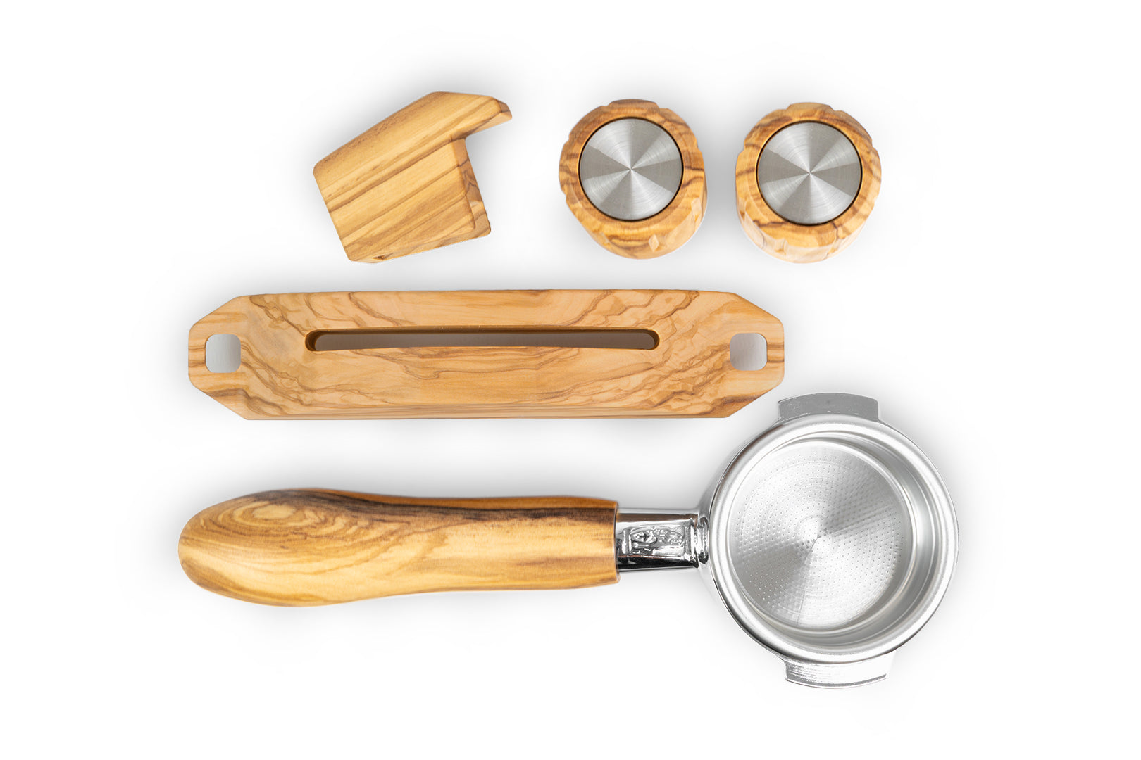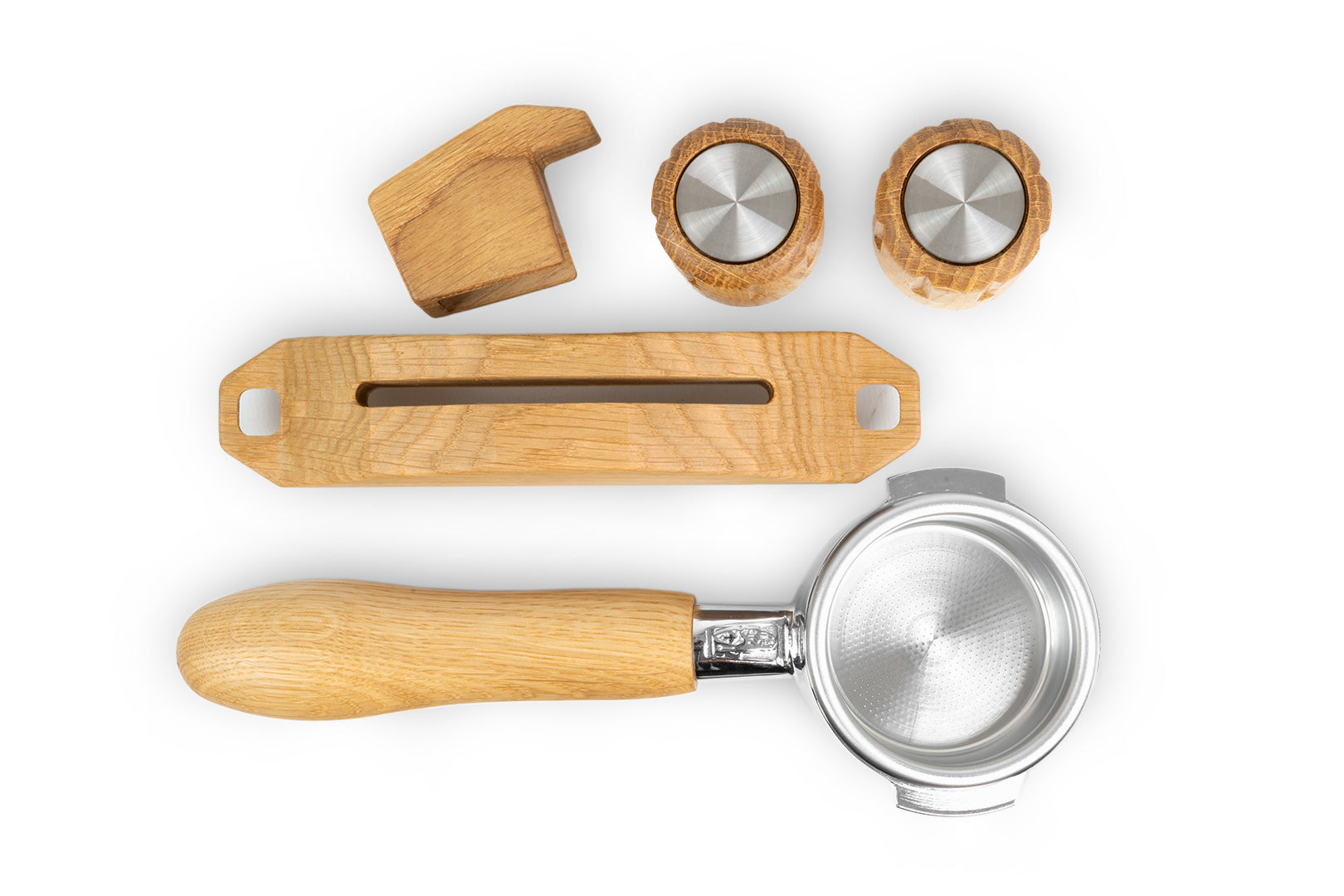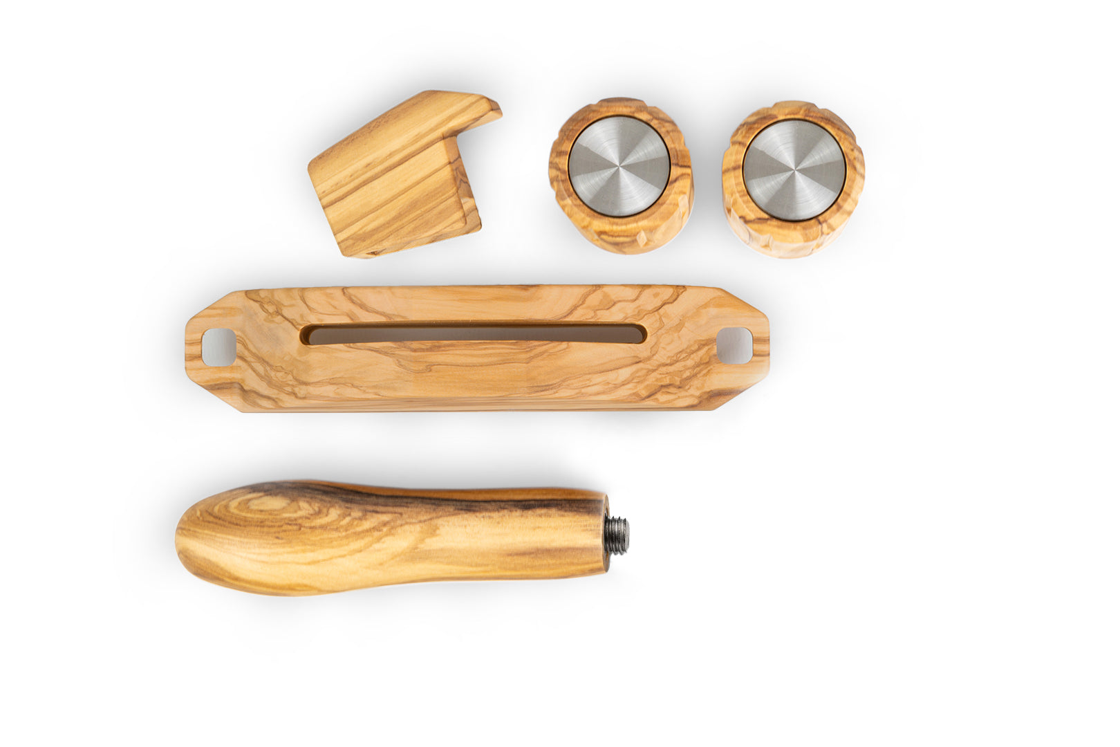 Dieses Veredelungsset umfasst zwei Drehknäufe, einen Paddlerahmen und das Paddle. Alle Teile sind in liebevoller Handarbeit gefertigt und bieten eine optimale Passgenauigkeit. Um das Erscheinungsbild ihres Barista Setups perfekt abzurunden, bieten wir in unserem Shop zusätzlich passende Siebträger- und Tampergriffe an.