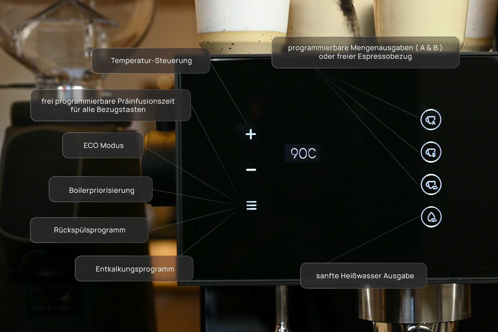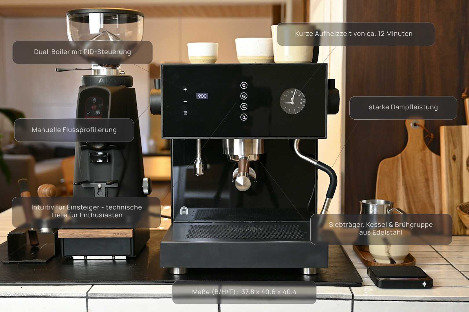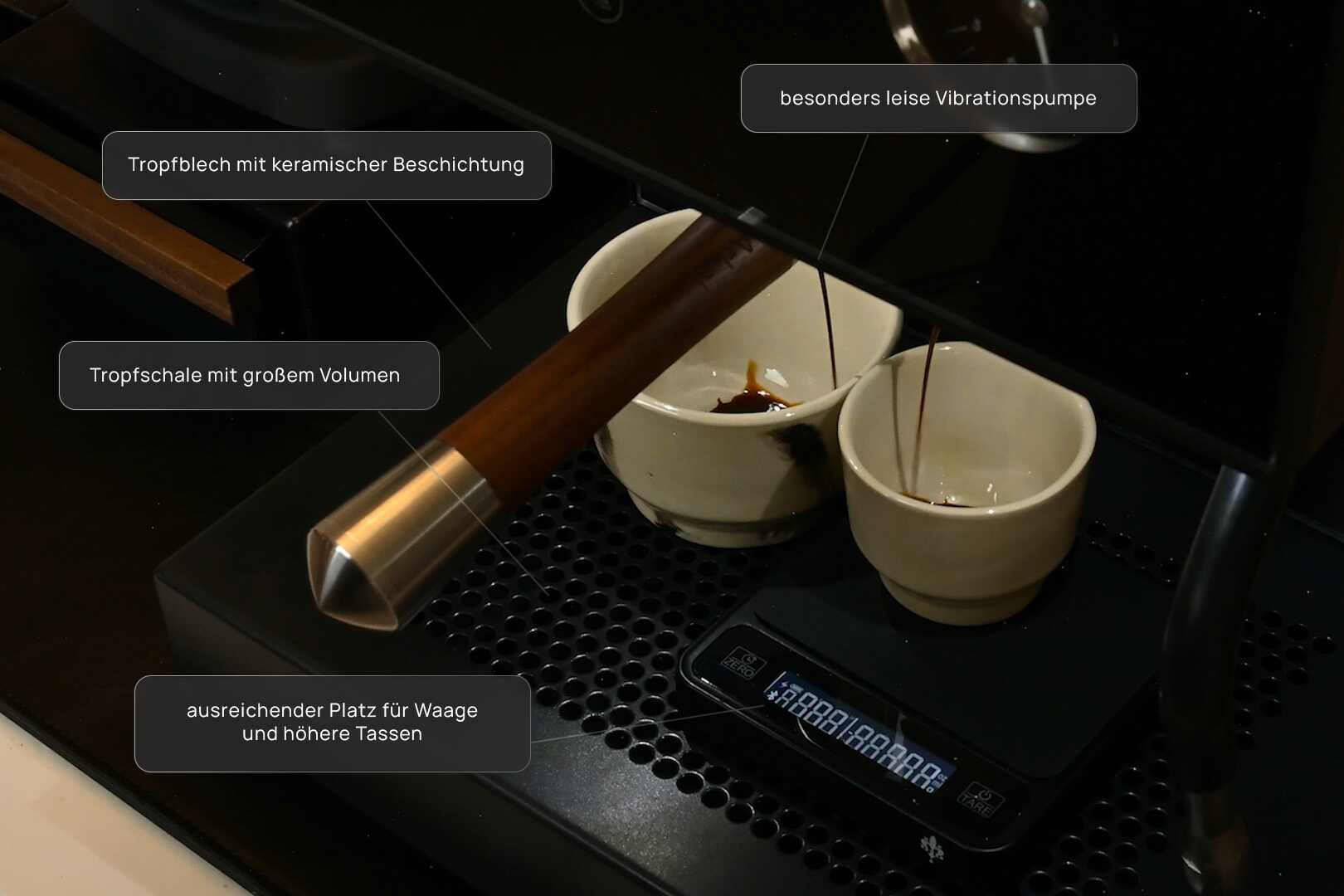 Features wie freier Espressobezug mit Flow Profiling, ein von außen einstellbares Expansionsventil, PID mit Shottimer & einer Temperaturstabilität von ±0,5 °C während der Extraktion bilden die Basis zur Weiterentwicklung eines jeden versierten Heimbarista! Dank der Dualboiler-Technologie ist der Wechsel der Brühtemperatur nur ein sanftes Tippen entfernt. Abgerundet wird das Gesamtbild durch IMS-Präzisionszubehör out-of-the-box. PS: Der Abstand von Tassenblech zu Siebträgerauslauf ist großzügig bemessen – somit ist für den Profi der Platz für Tassen samt Waage garantiert!
