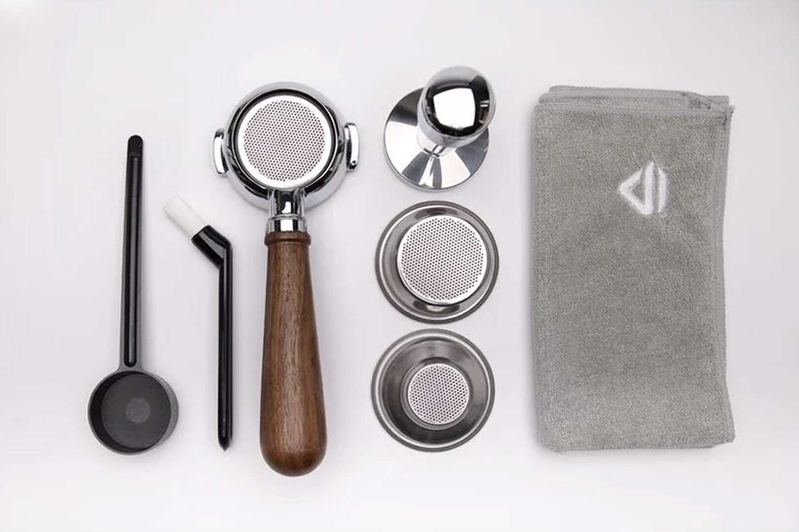 Lieferumfang | 1x Lelit Bianca V3 PL162T mit Kipphebelumbau & Nussholzapplikationen, 1x Lelit Tamper, 1x Doppelsiebträger mit Doppelsieb, 1x bodenloser Siebträger mit einfachem Sieb, 1x Blindsieb, 1x Reinigungsbürste und -tuch, 1x Montagezubehör Festwasseranschluss inkl. Zu- und Abwasserleitung |