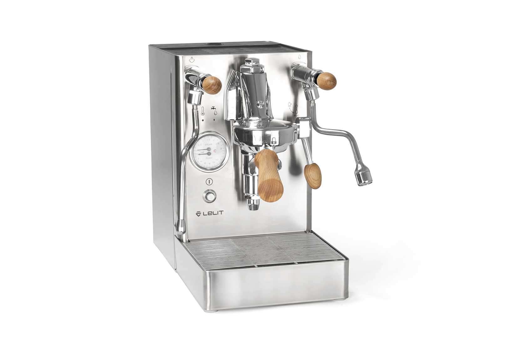 Das Gehäuse ist in satiniertem Edelstahl gehalten und stellt somit die verchromten Elemente in den Vordergrund. Mit den von uns verbauten Kippventilen, welche bei Betätigung zur Seite hin einrasten, kann Wasserdampf und Heißwasser bezogen werden, während der nach oben herausnehmbare Wassertank intuitiv und einfach aufgefüllt werden kann. Ein individuelles Merkmal ist der originale Siebträger von Lelit, dessen Ausläufe den Espresso nicht wie üblich von der Seite, sondern direkt von vorne in die Tasse leiten.