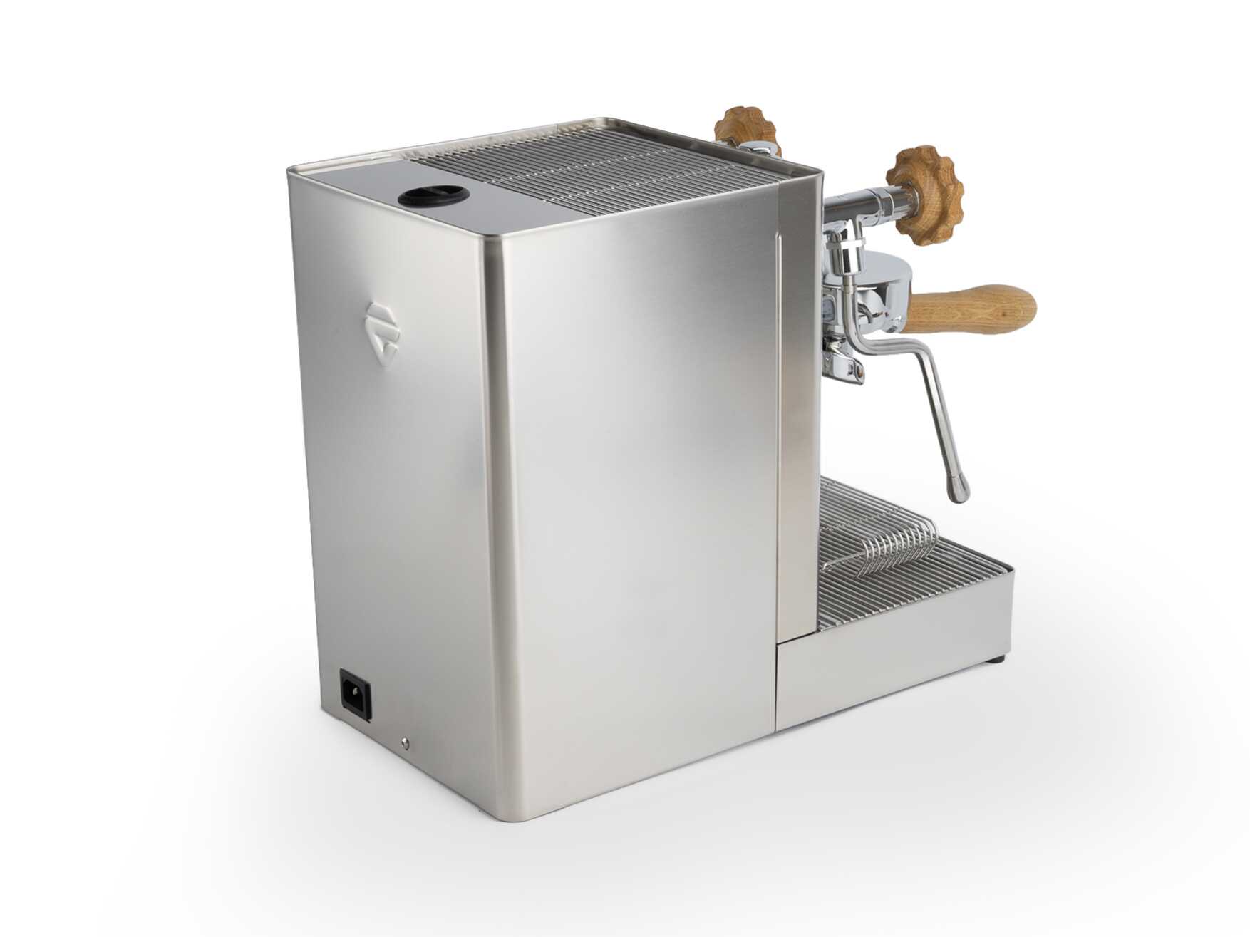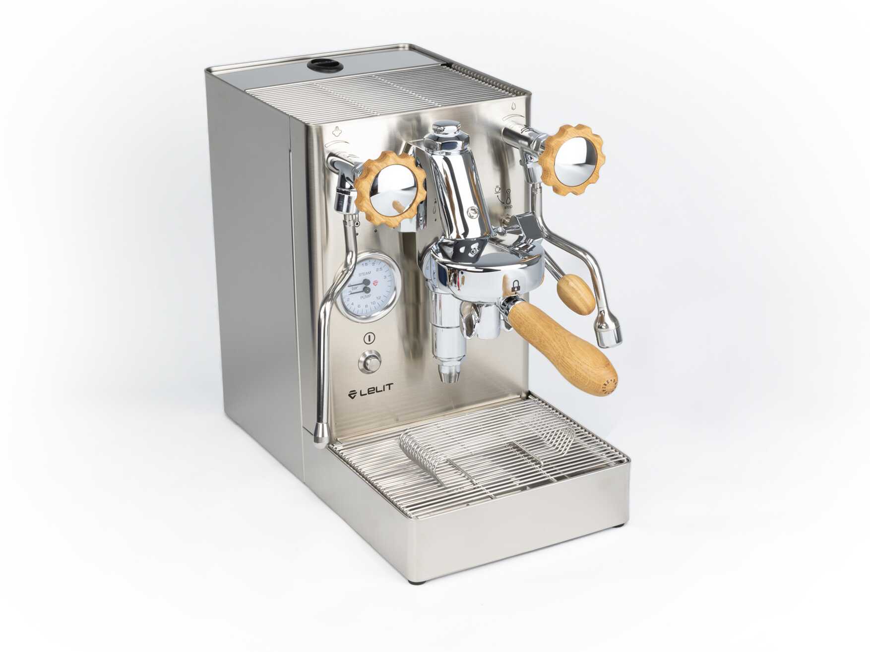 Das Gehäuse aus satiniertem Edelstahl hebt die verchromten Elemente hervor und verleiht der Maschine einen eleganten Look. Einzigartig ist der originale Siebträger von Lelit, dessen Ausläufe den Espresso nicht seitlich, sondern direkt von vorne in die Tasse leiten.
